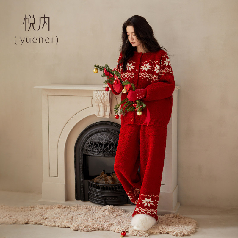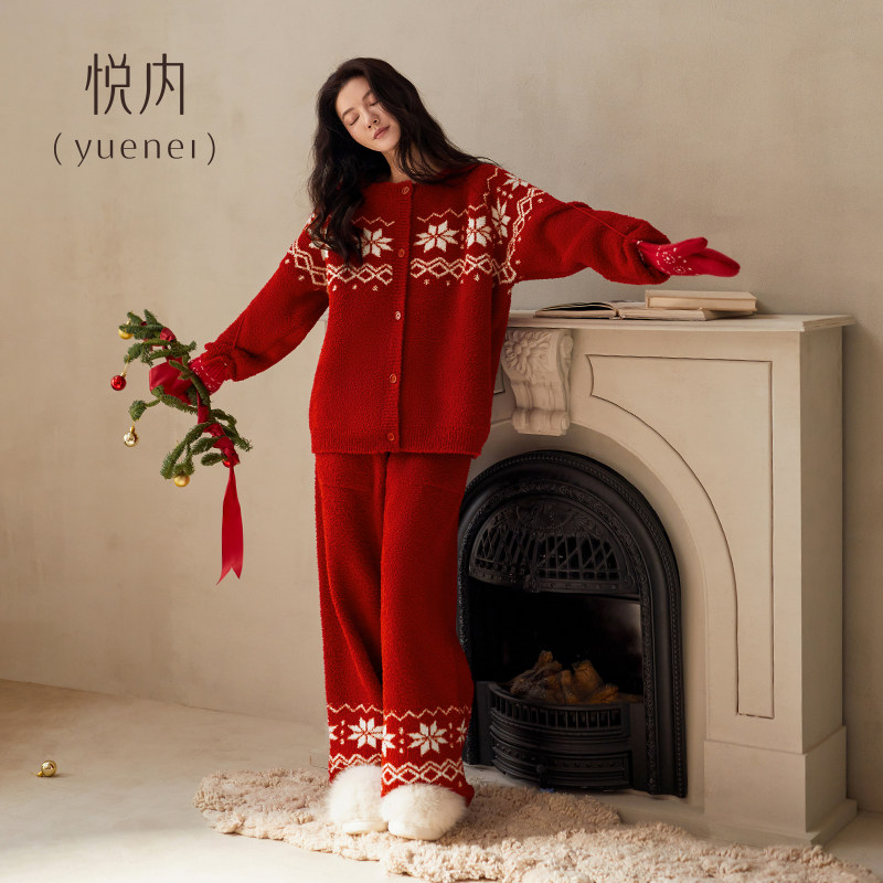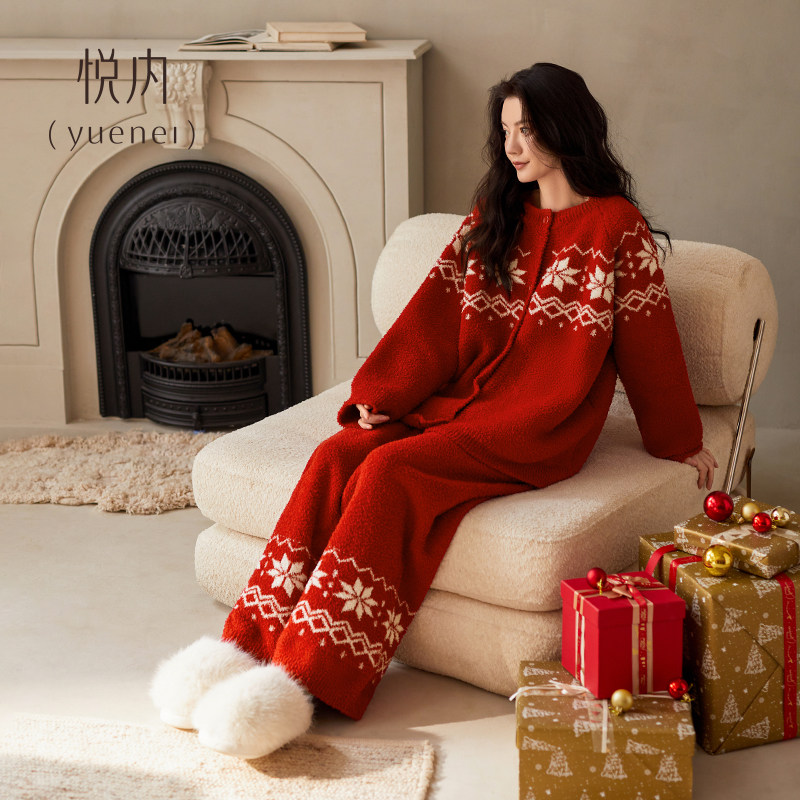 悦内半边绒睡衣女冬季加厚加绒珊瑚绒家居服红色本命年新年费尔岛