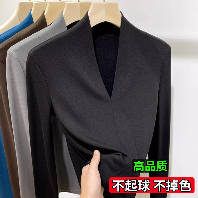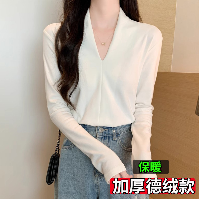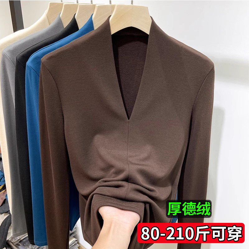 大码胖mm德绒打底衫女秋冬深V领磨毛长袖t恤小衫外穿内搭早秋上衣