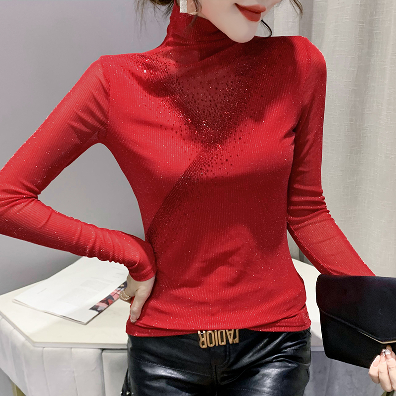 高领网纱打底衫女秋冬2024新款洋气烫钻长袖T恤内搭上衣气质小衫
