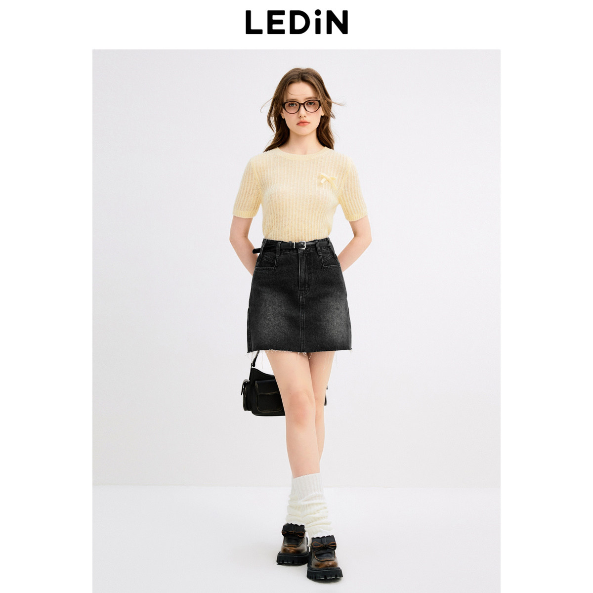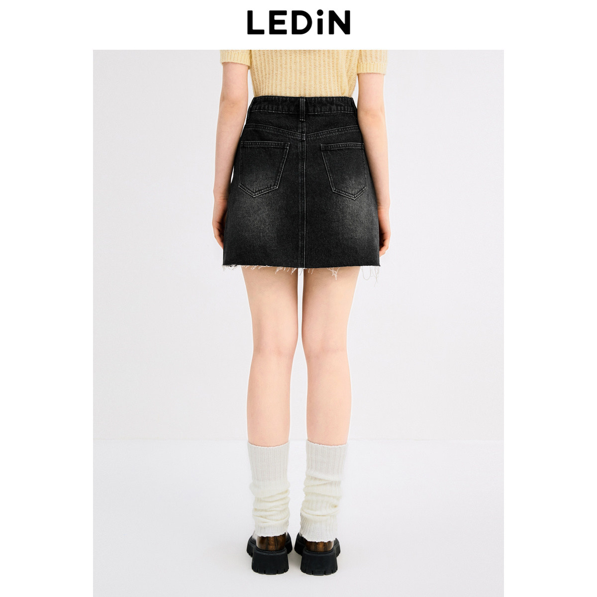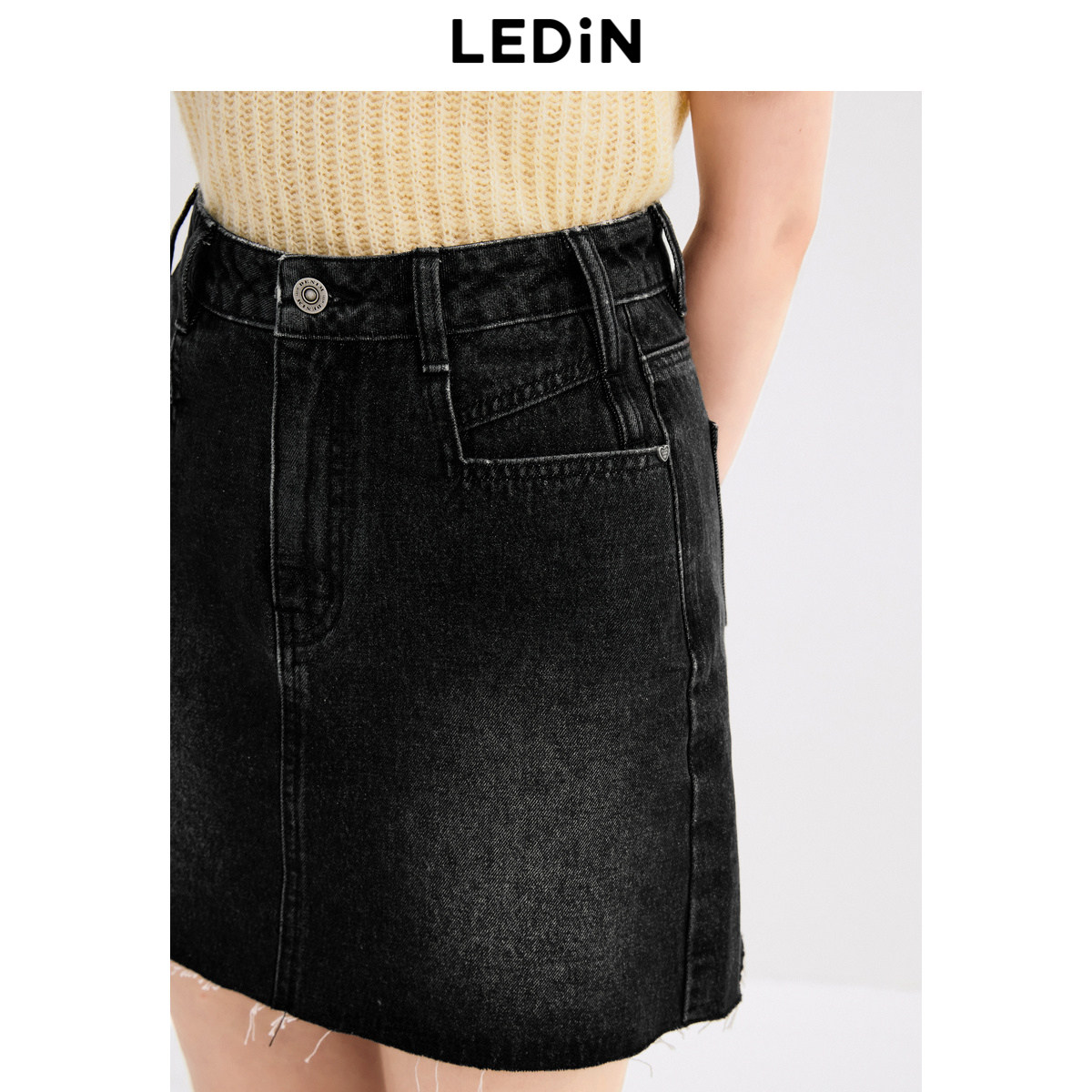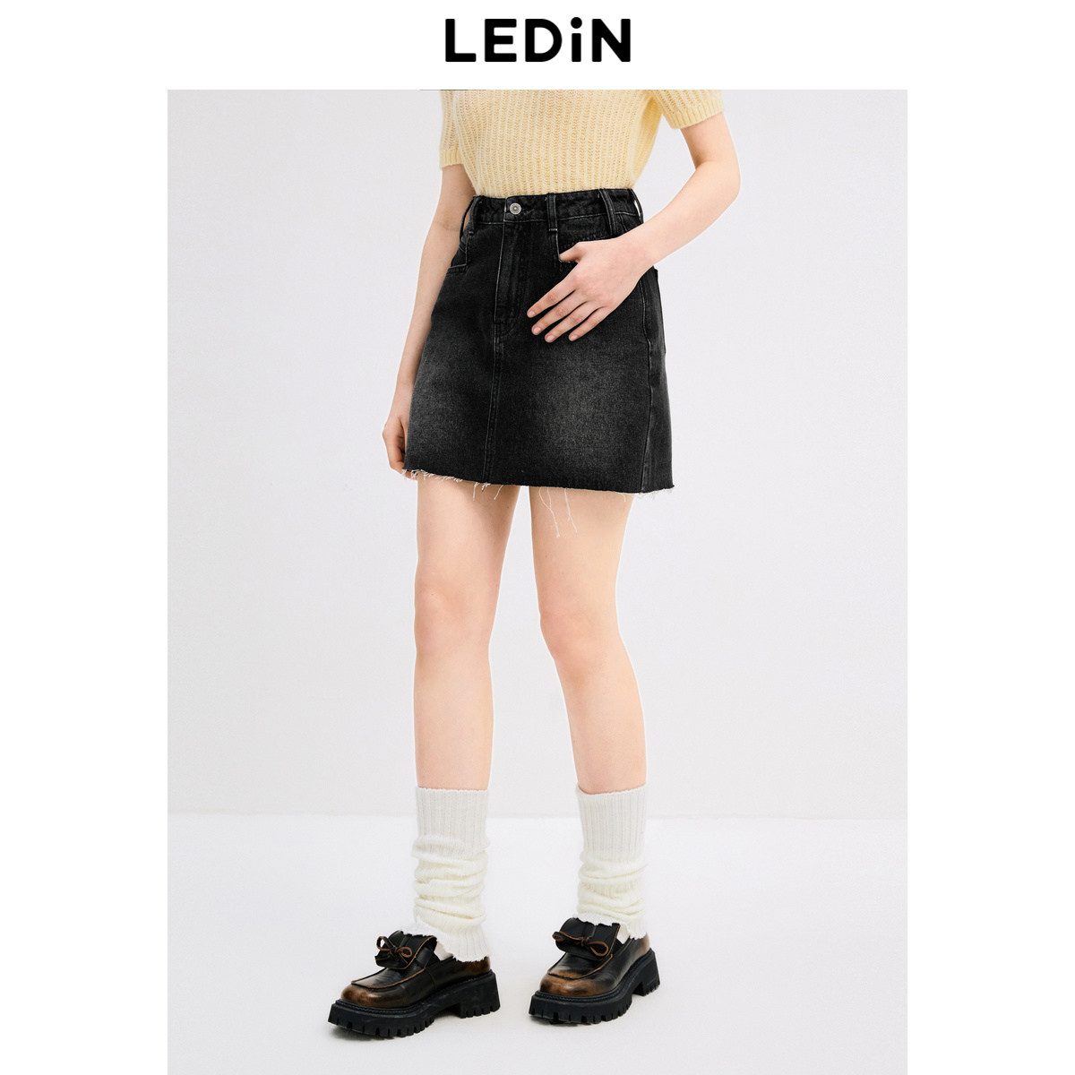 乐町黑色水洗牛仔半裙秋季新款马骝喷色A字挤基础毛边短裙