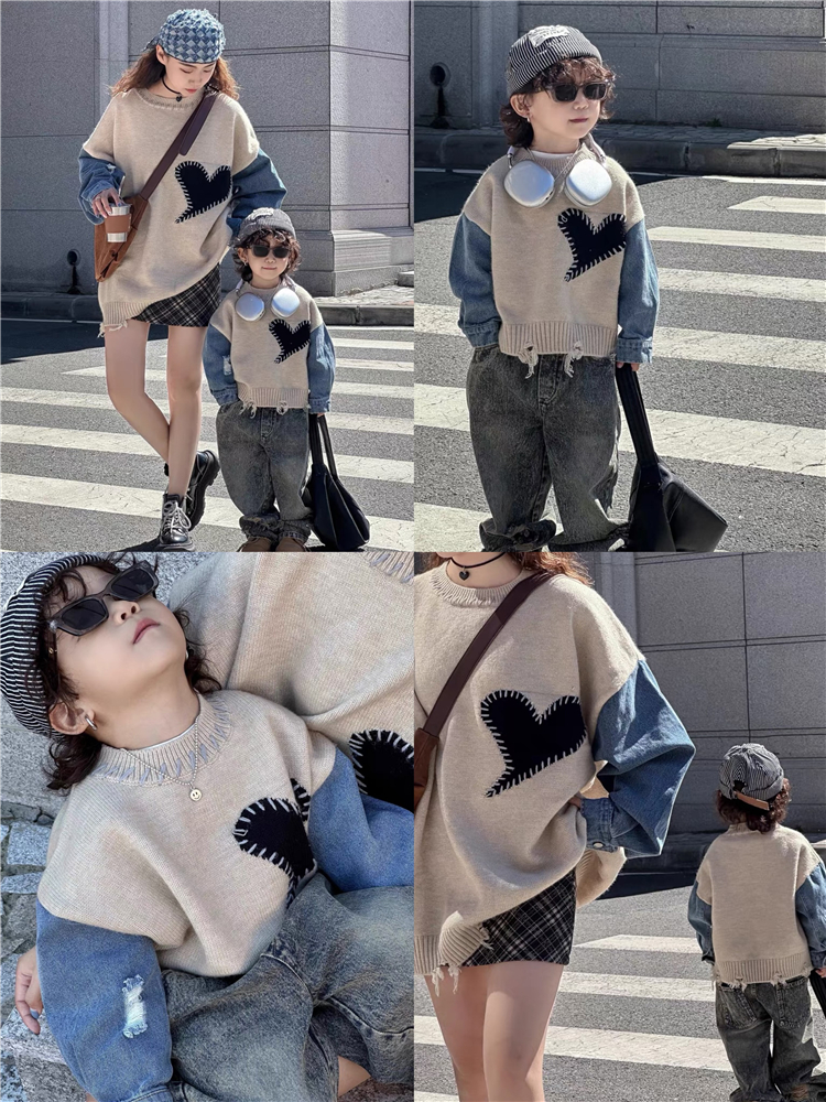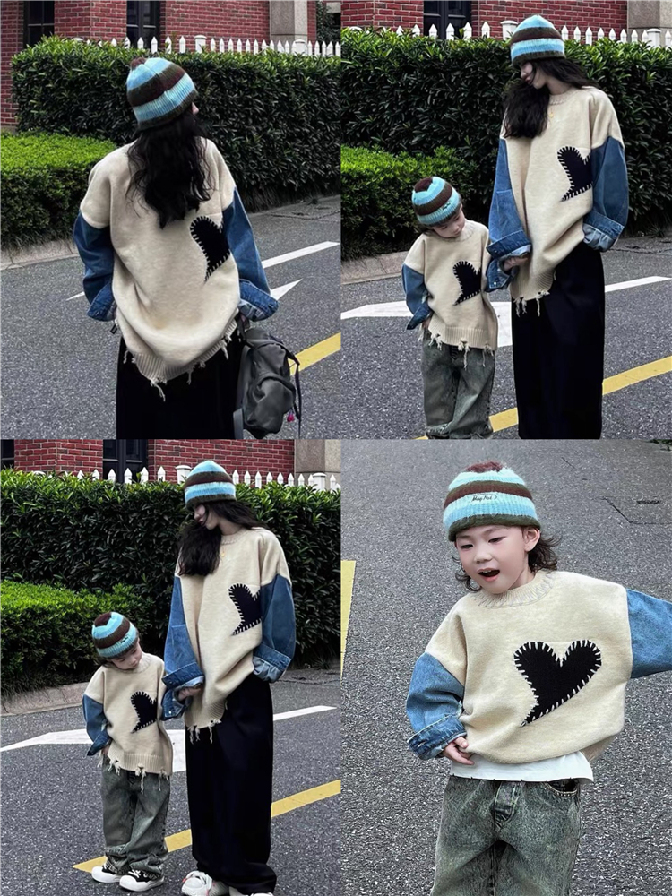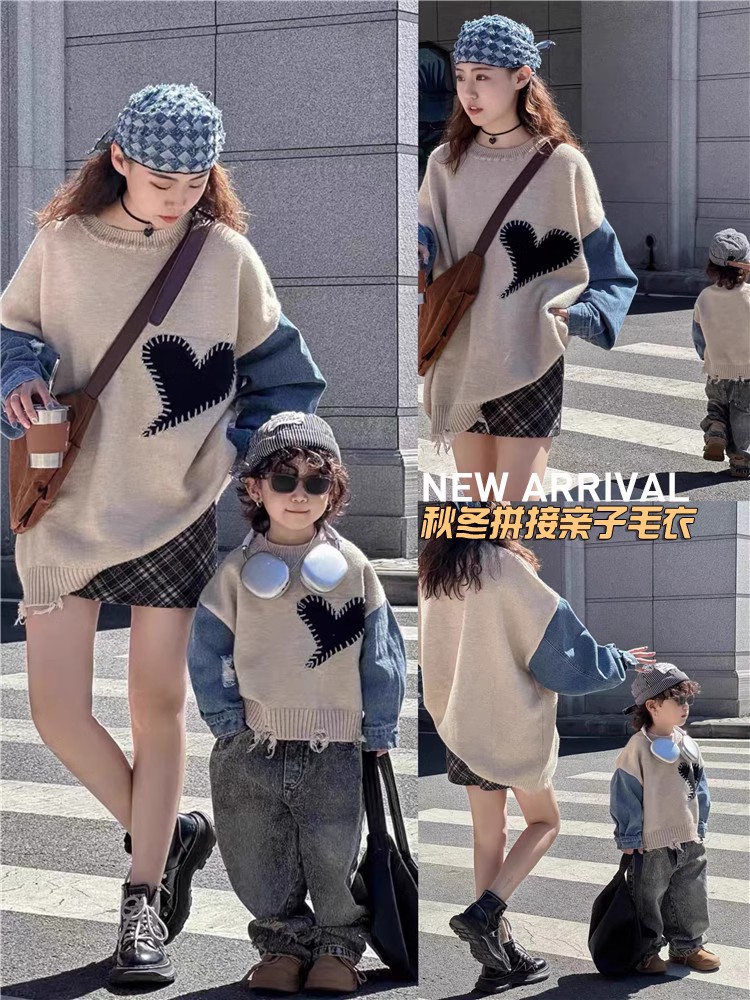 炸街亲子装一家三口拼接撞色毛衣母女母子装针织爱心婴儿连体儿童