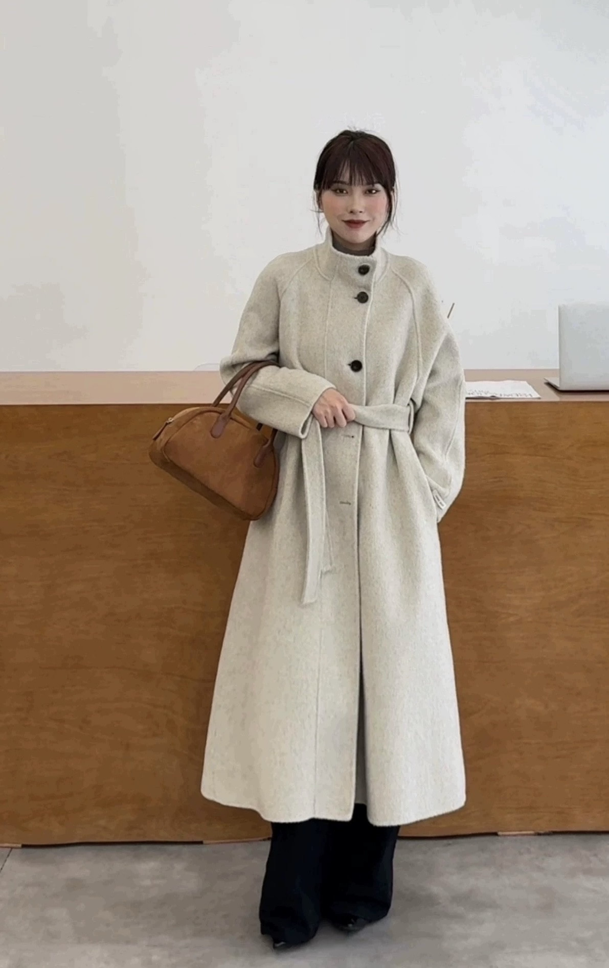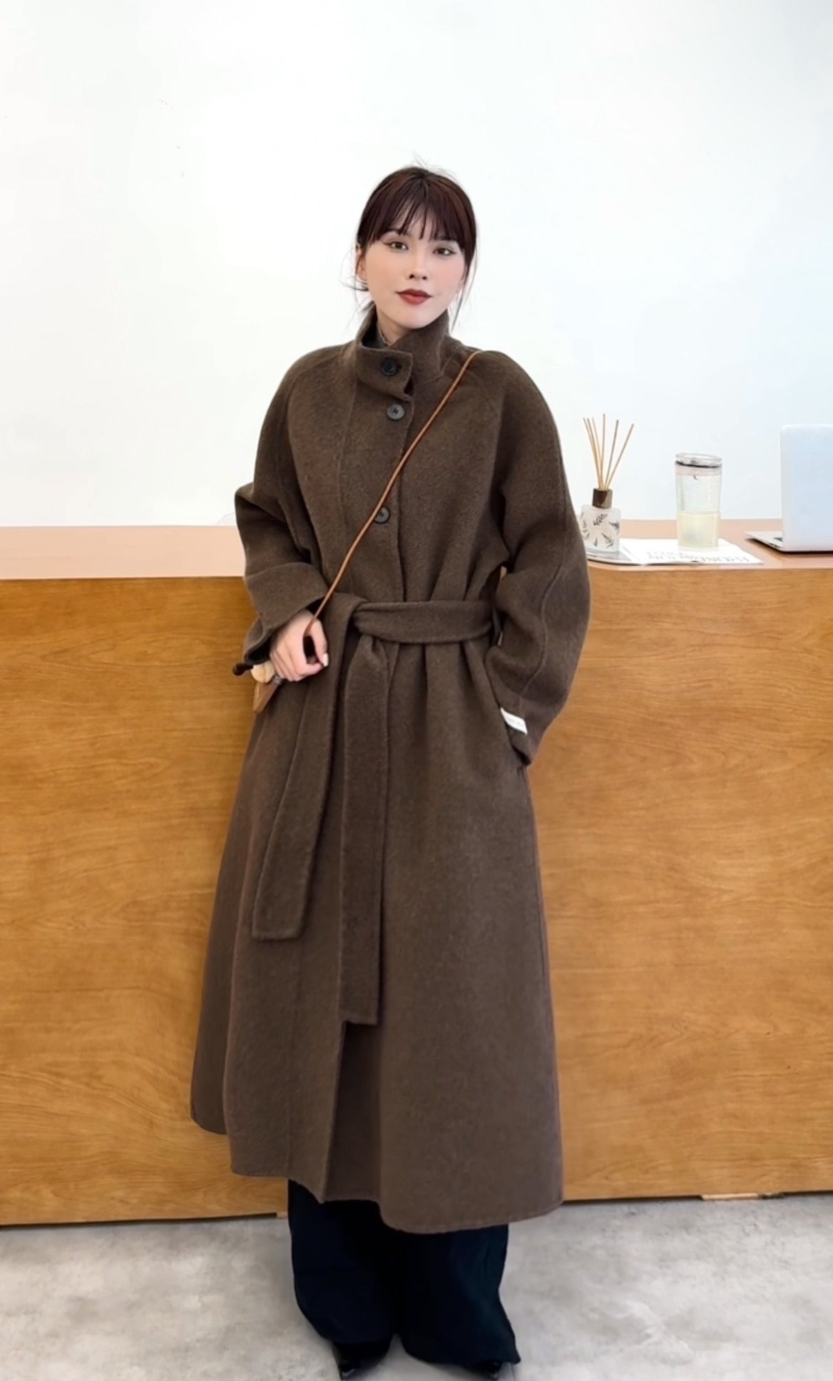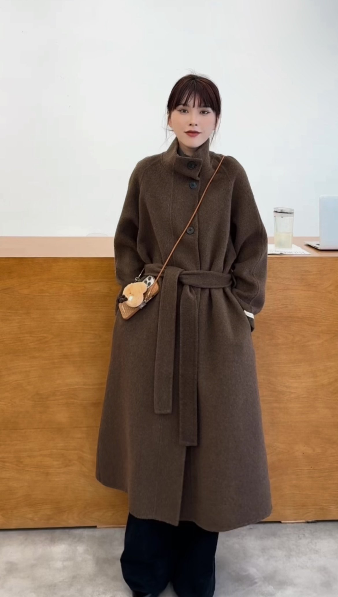 立领双面羊毛大衣女长款2025冬季新款韩版A版系带裙摆羊毛呢外套