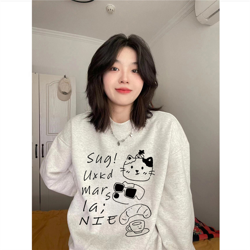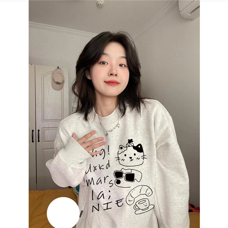 纯棉美式复古卡通加绒加厚圆领卫衣女秋冬慵懒设计感加绒长袖上衣