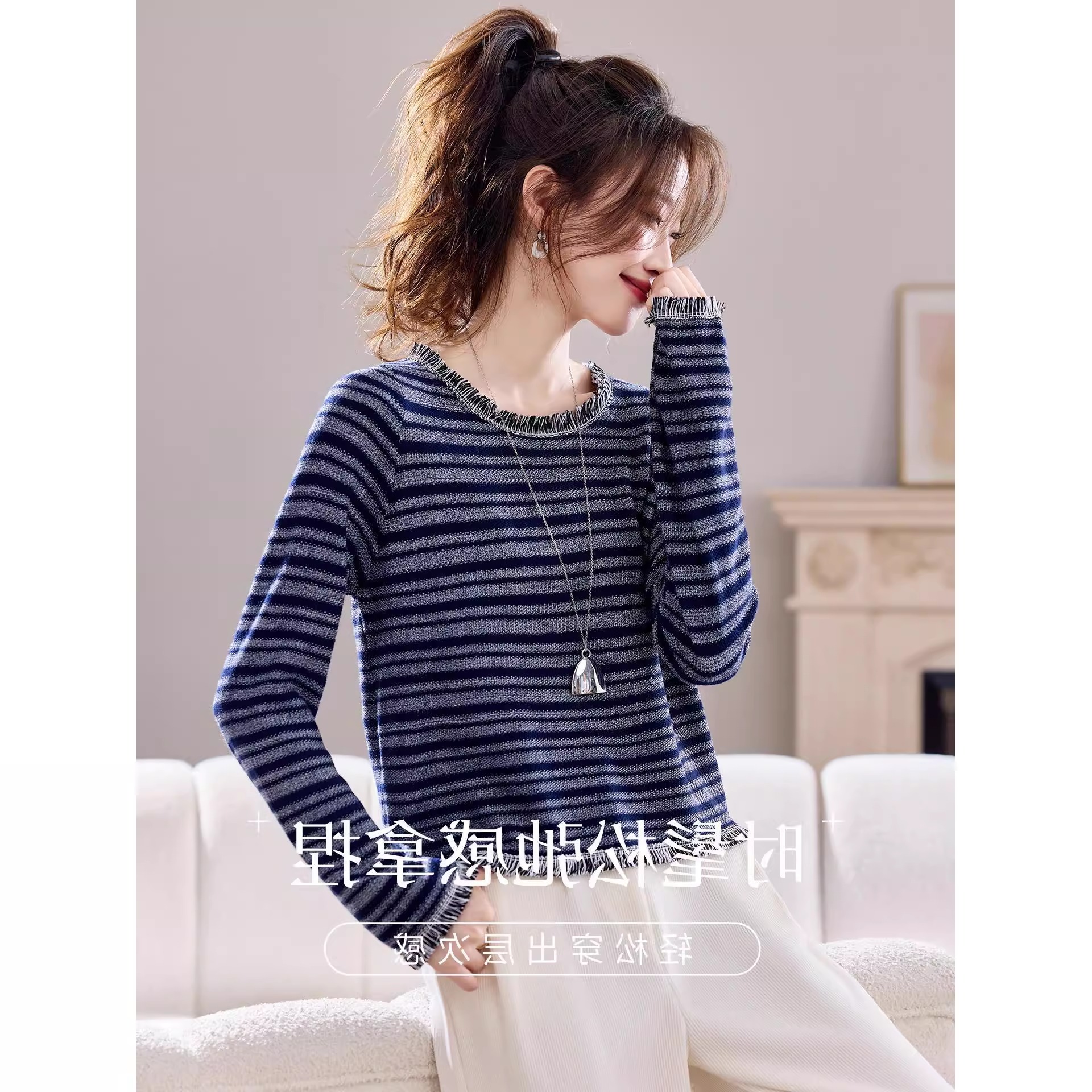 杭州四季青高端爆款~小个子蓝色条纹针织上衣女秋宽松毛衣打底衫