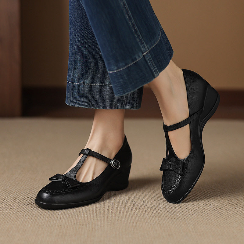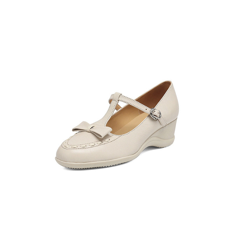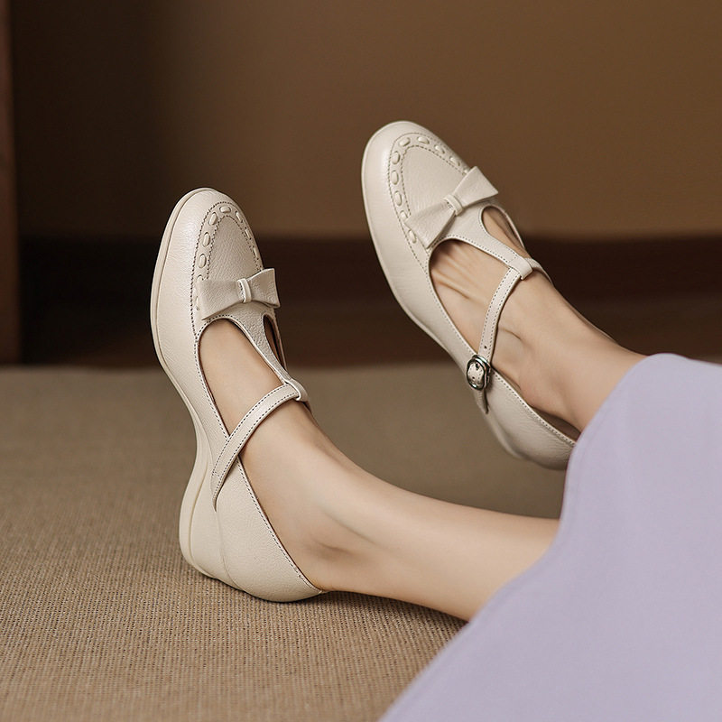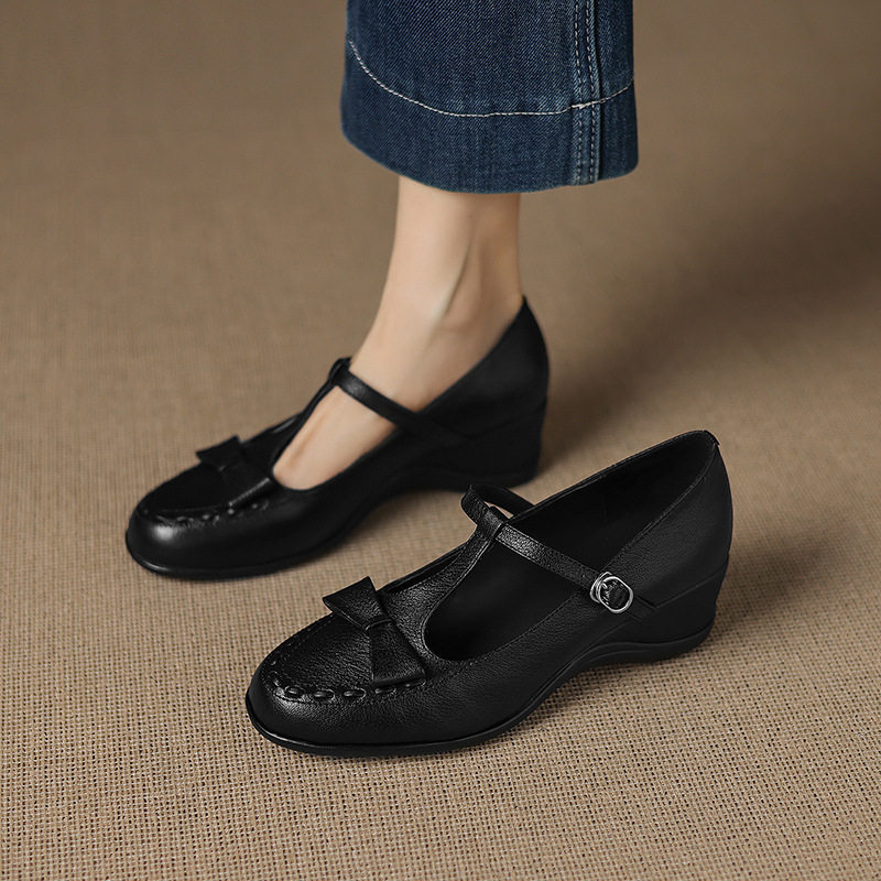 学院风编织小羊皮蝴蝶结圆头T字扣带玛丽珍小皮鞋坡跟浅口单鞋女