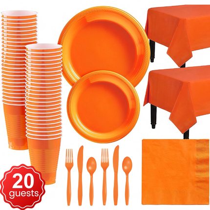 橘色橙色一次性塑料盘子杯子餐具套装万圣节感恩节派对装饰桌布