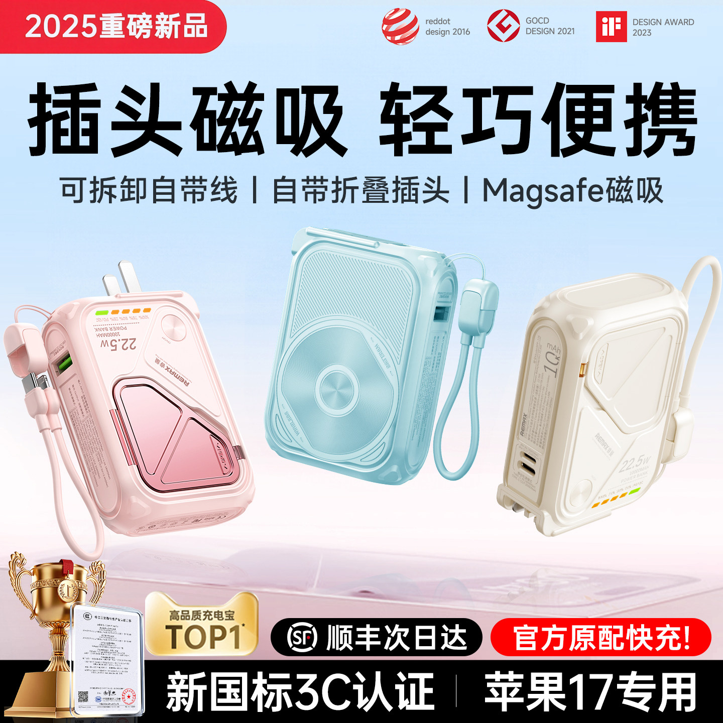 【新国标3C认证】remax睿量20000毫安充电宝磁吸款自带线插头三合一无线快充适用iPhone1617苹果手机小巧便携