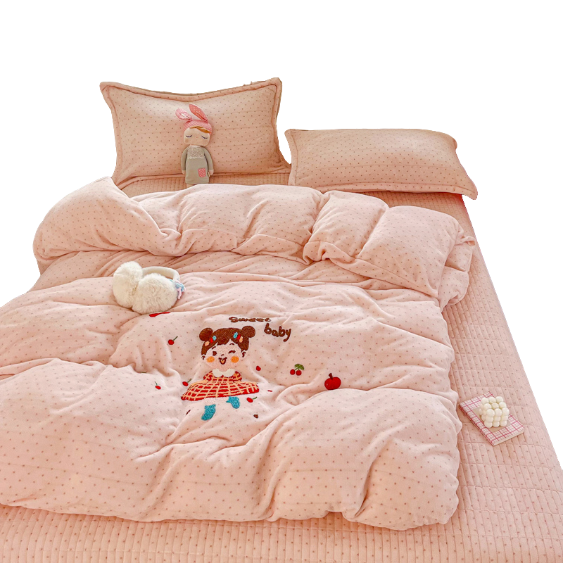 可爱卡通牛奶绒绣花床盖四件套秋冬季加厚珊瑚法兰绒床单被套床品