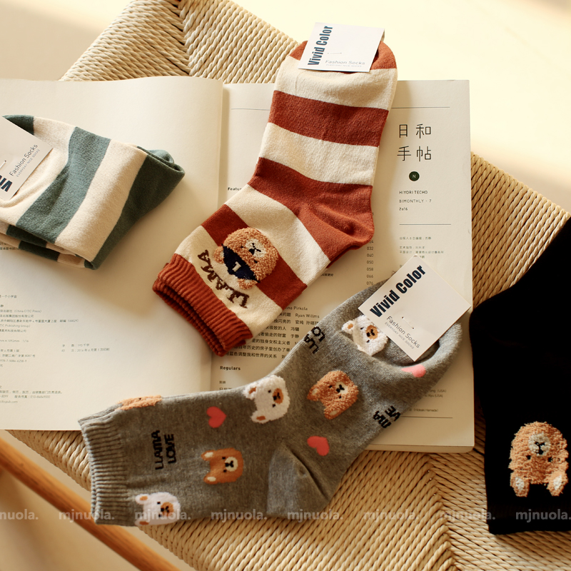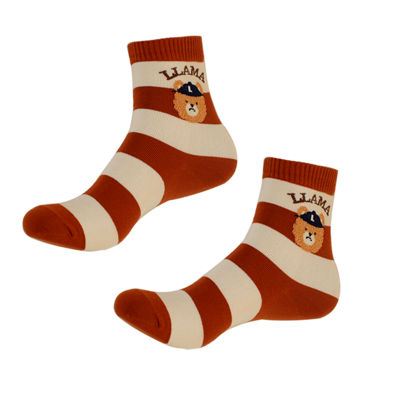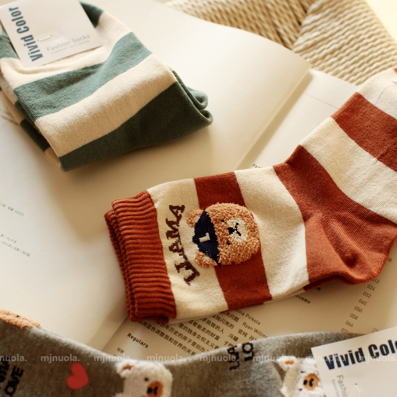 米吉诺拉 秋冬季字母可爱卡通小熊袜子女款宽条纹运动纯棉中筒袜
