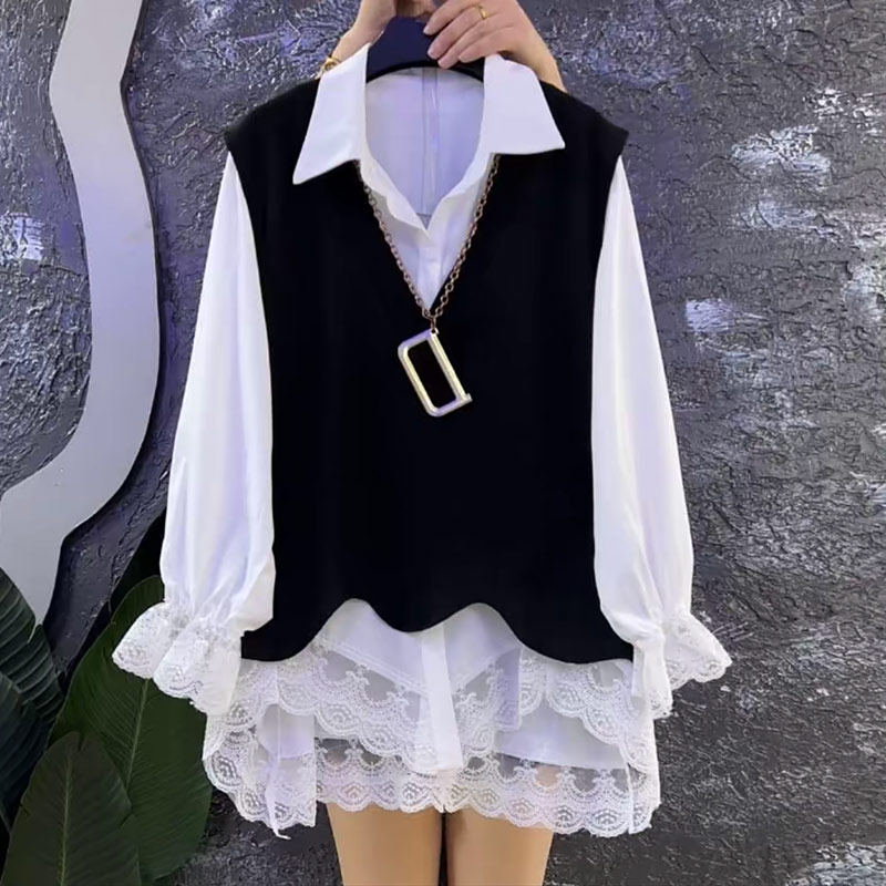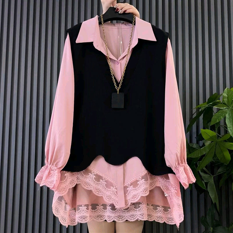加肥V领不规则底摆马甲蕾丝翻领衬衫韩版大码女装秋季显瘦两件套