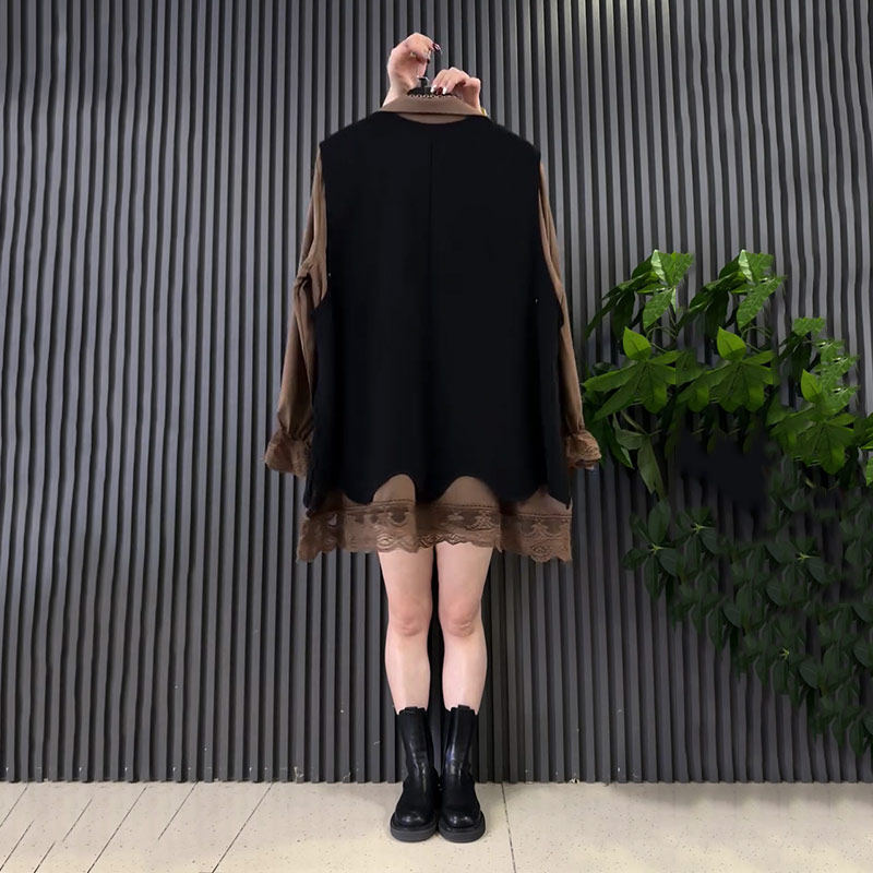V领不规则底摆马甲蕾丝翻领衬衫