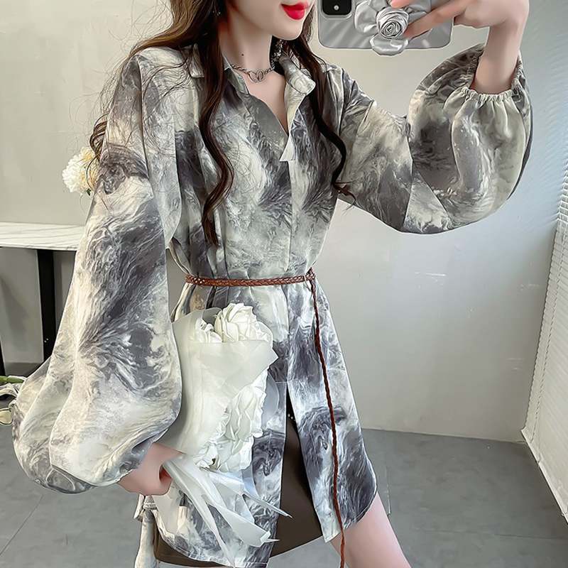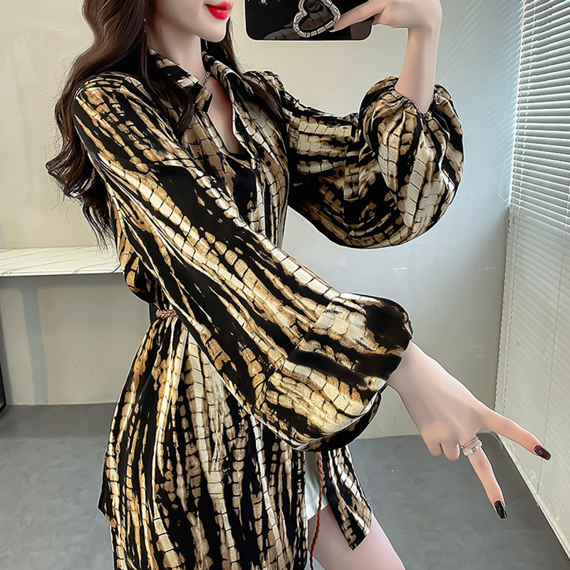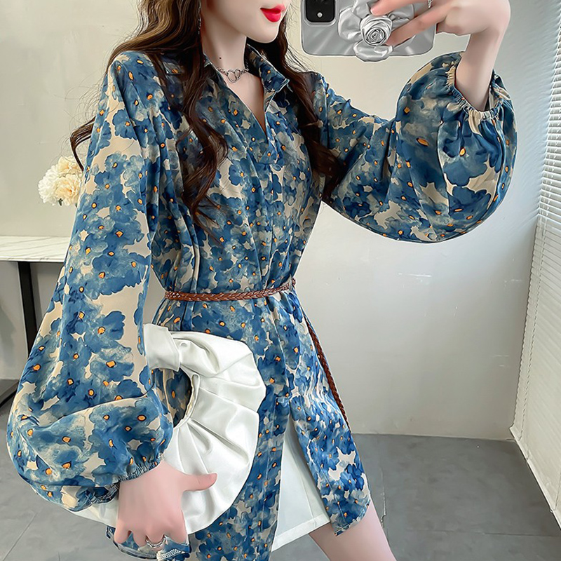 胖MM法式小资衬衫时髦印花中长款开叉衬衣独特腰带收腰长袖上衣秋