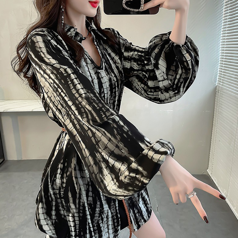 胖MM法式小资衬衫时髦印花中长款