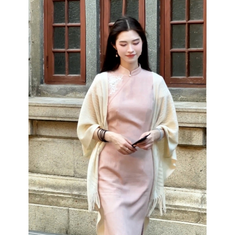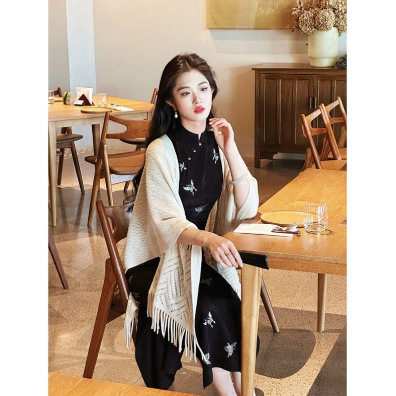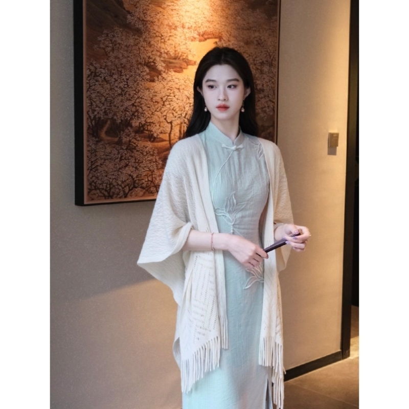新中式旗袍外搭针织披风女春夏纯色百搭中长款披肩毛衣开衫外套