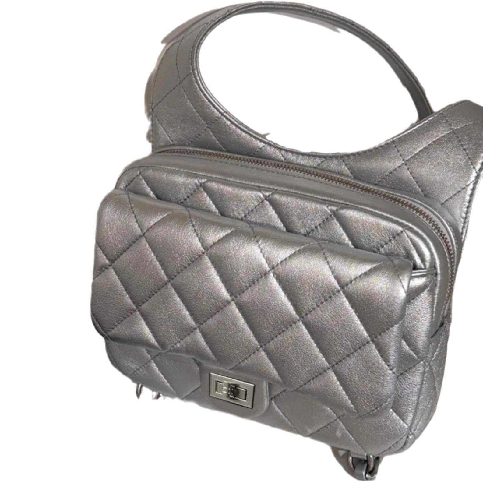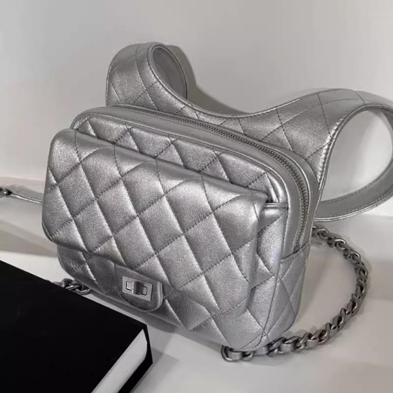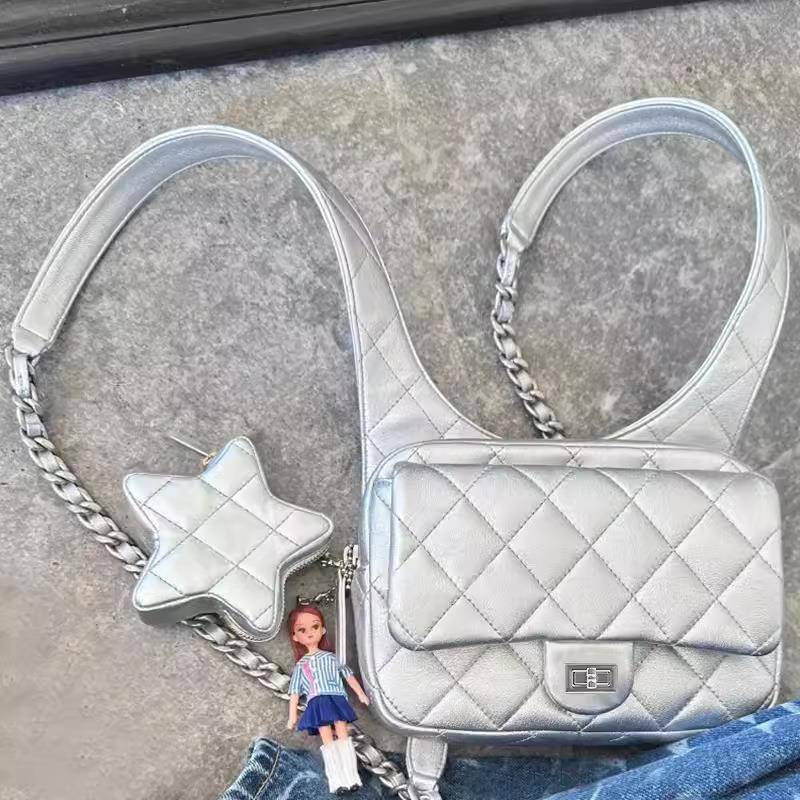 香港品牌银色菱格小香风链条双肩包包女2025新款时尚高级感大容量