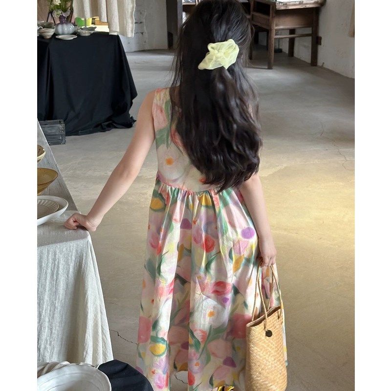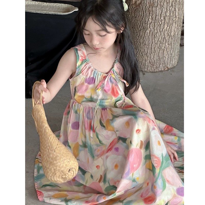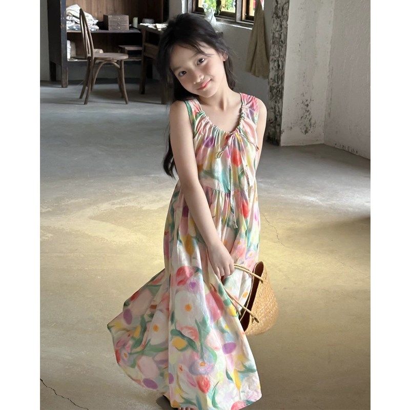 女孩背心连衣裙2024夏装中大童女童油画连衣裙夏季度假风沙滩长裙
