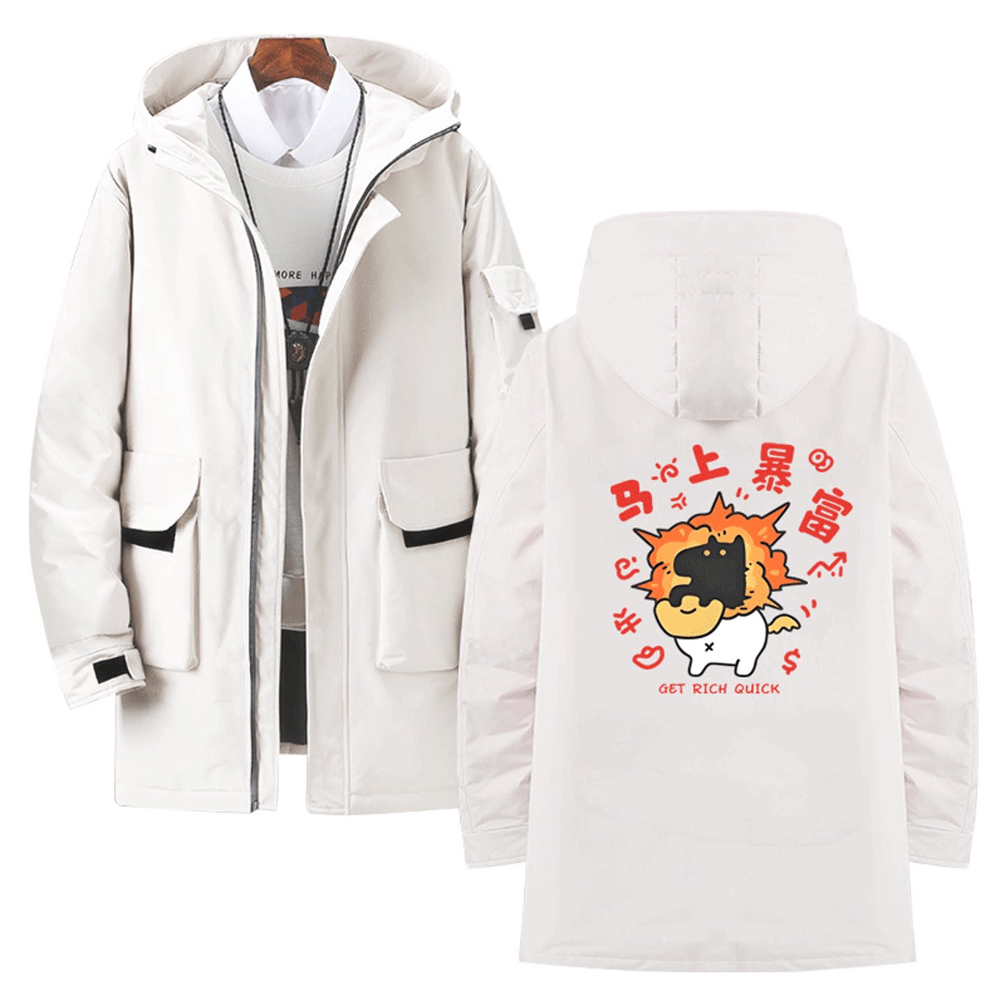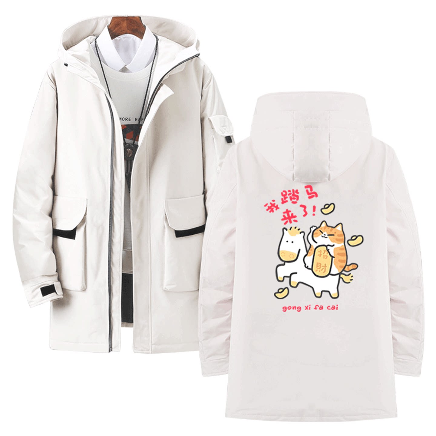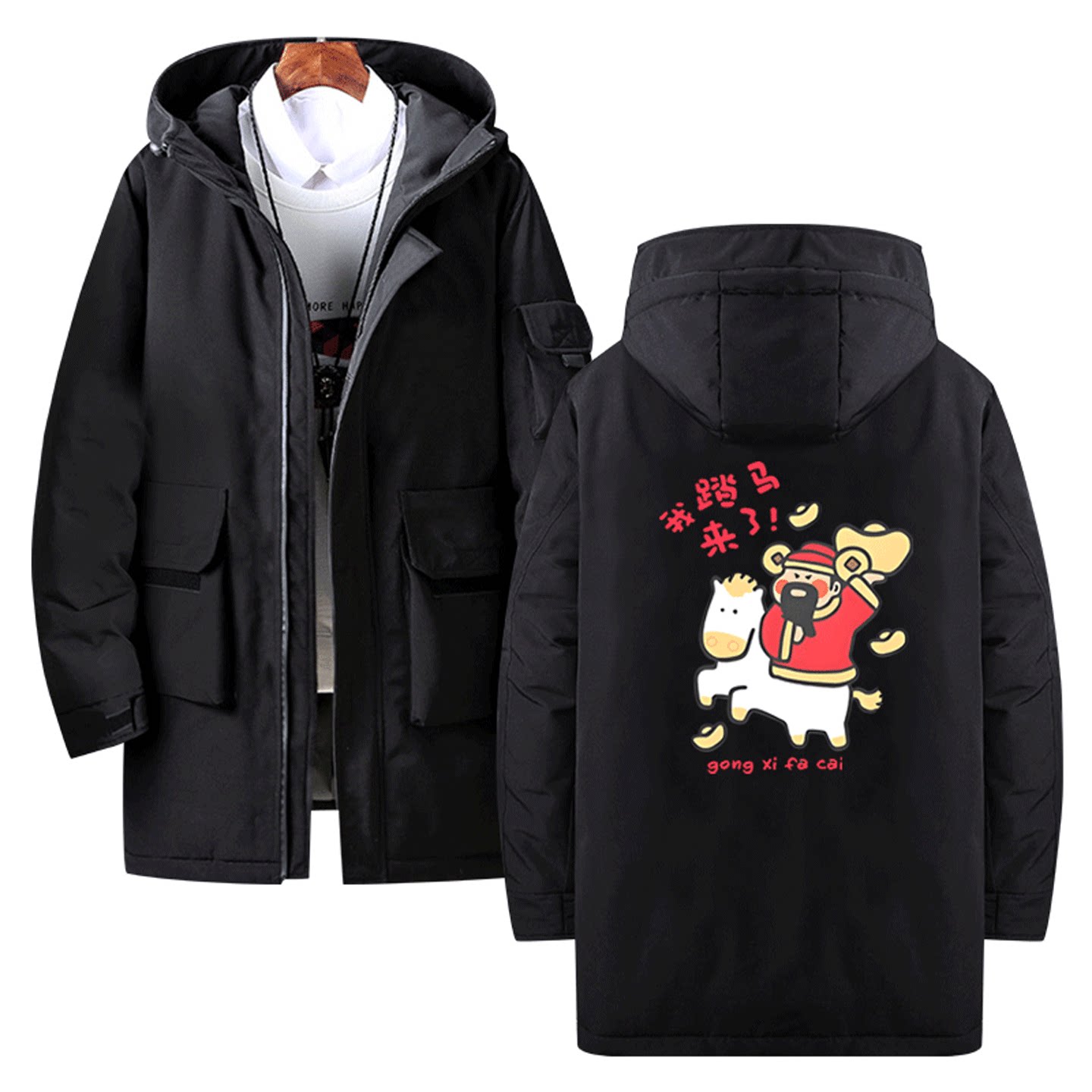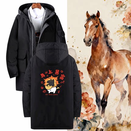 国潮卡通财神我踏马来了印花新年招财猫拜年发财定制中长款羽绒服