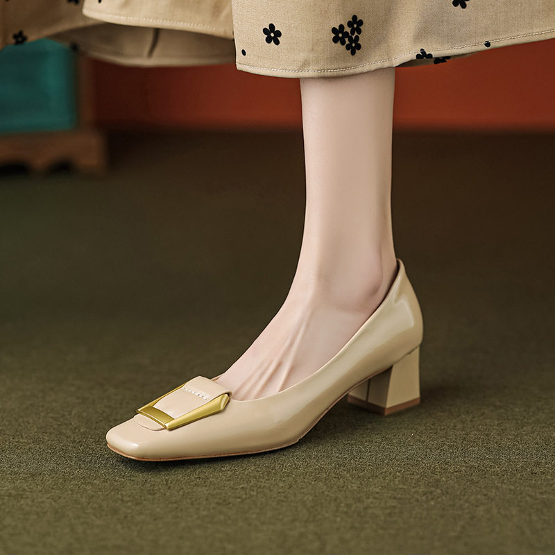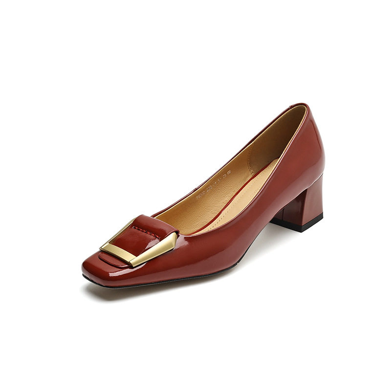 韩版春夏新款真皮方扣粗跟单鞋复古酒红色时尚气质女鞋中跟四季鞋