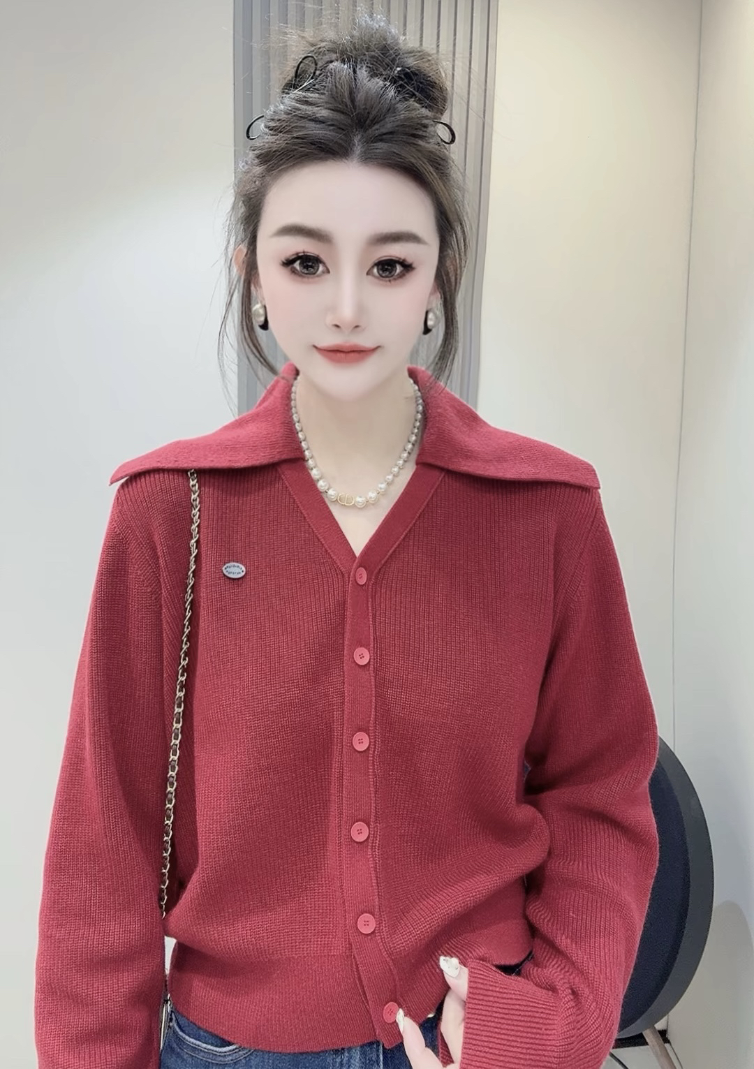 欧货2025春季新款拼接金属牌披肩领针织衫女时尚洋气百搭开衫上衣
