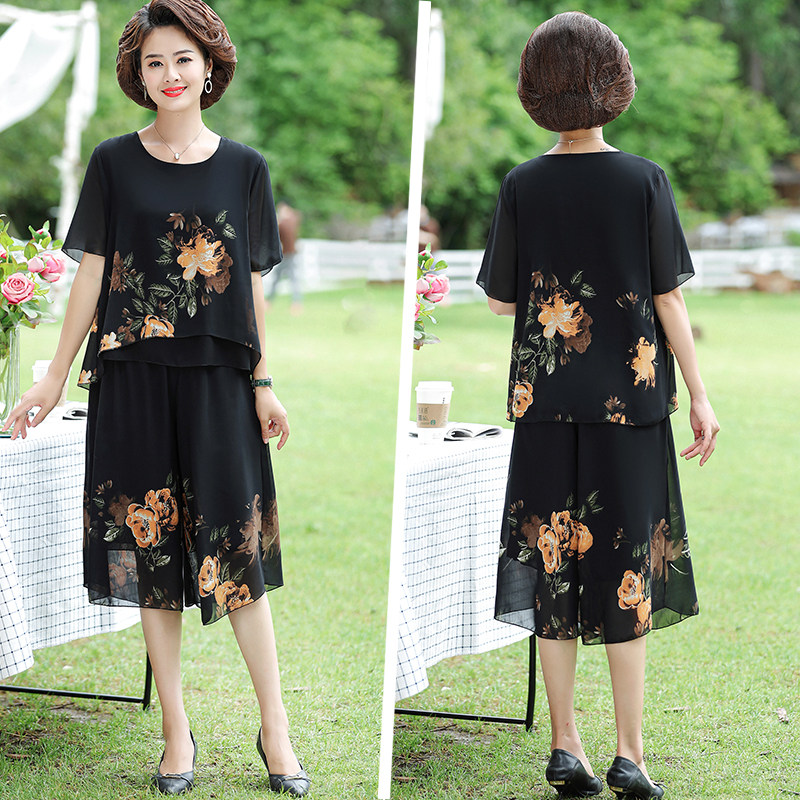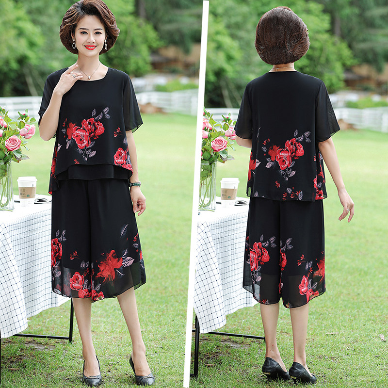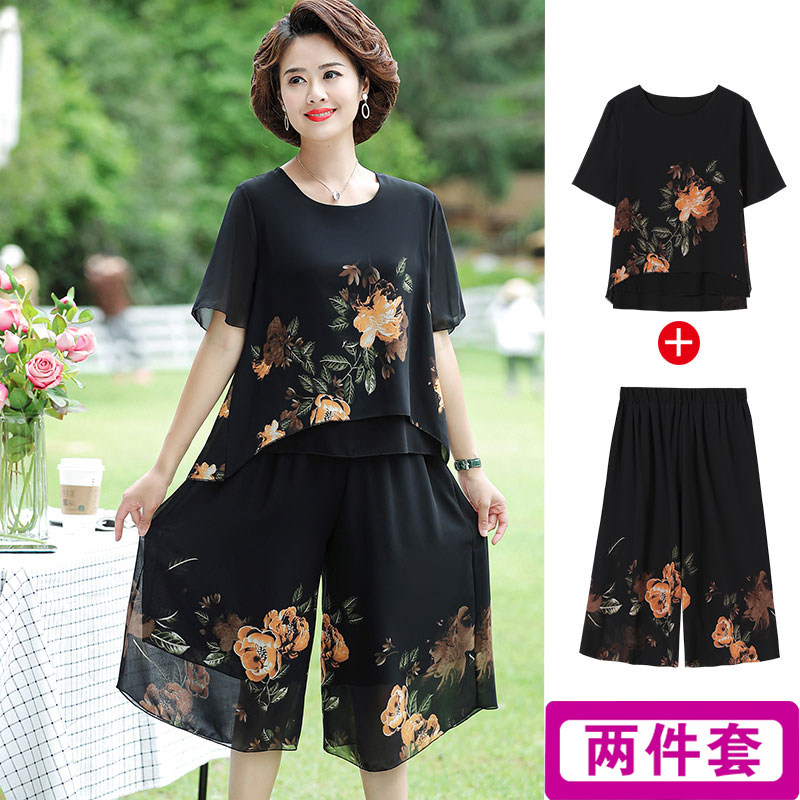 妈妈夏装2021新款洋气上衣中年人小衫中老年女装短袖雪纺两件套装