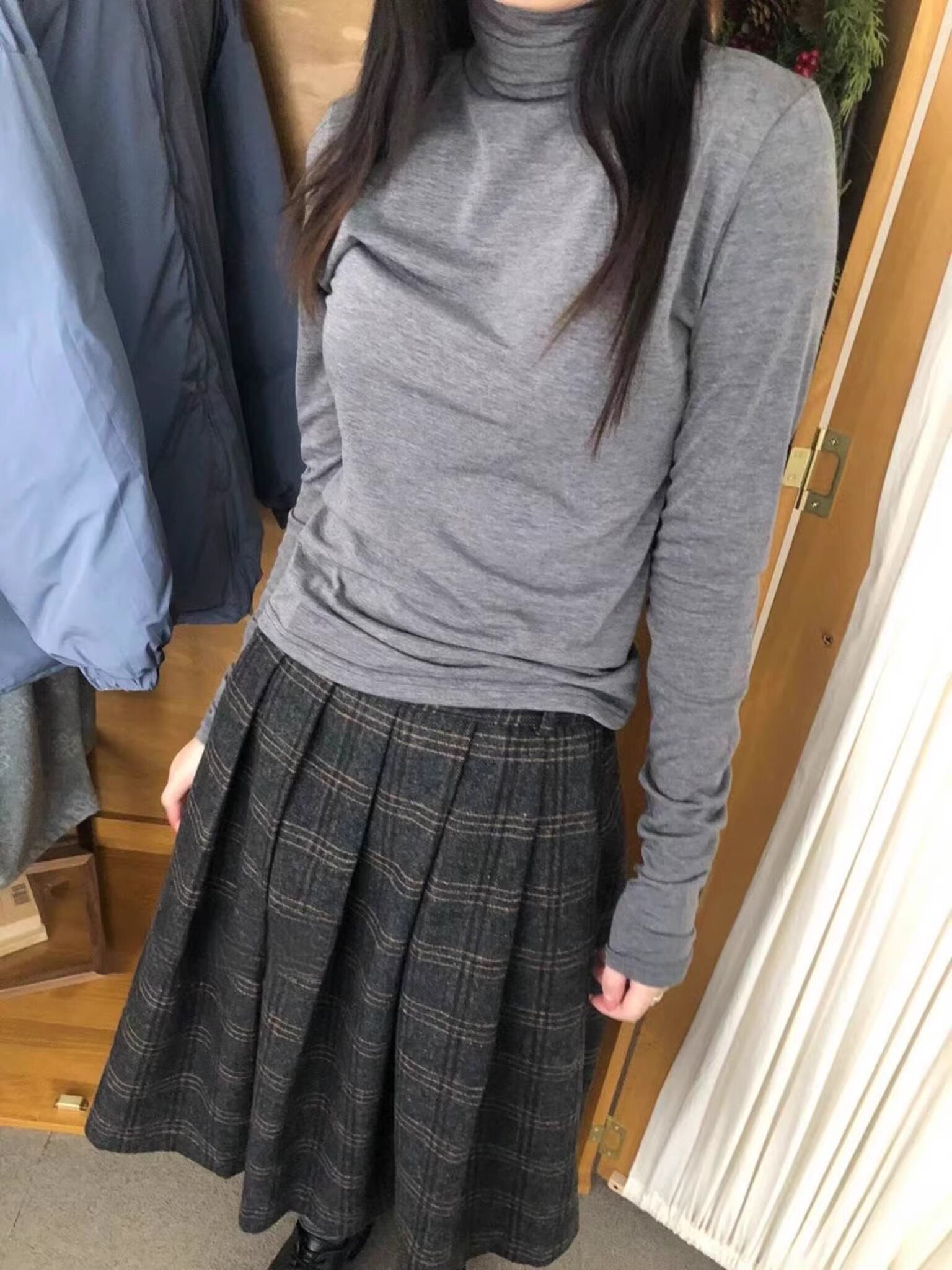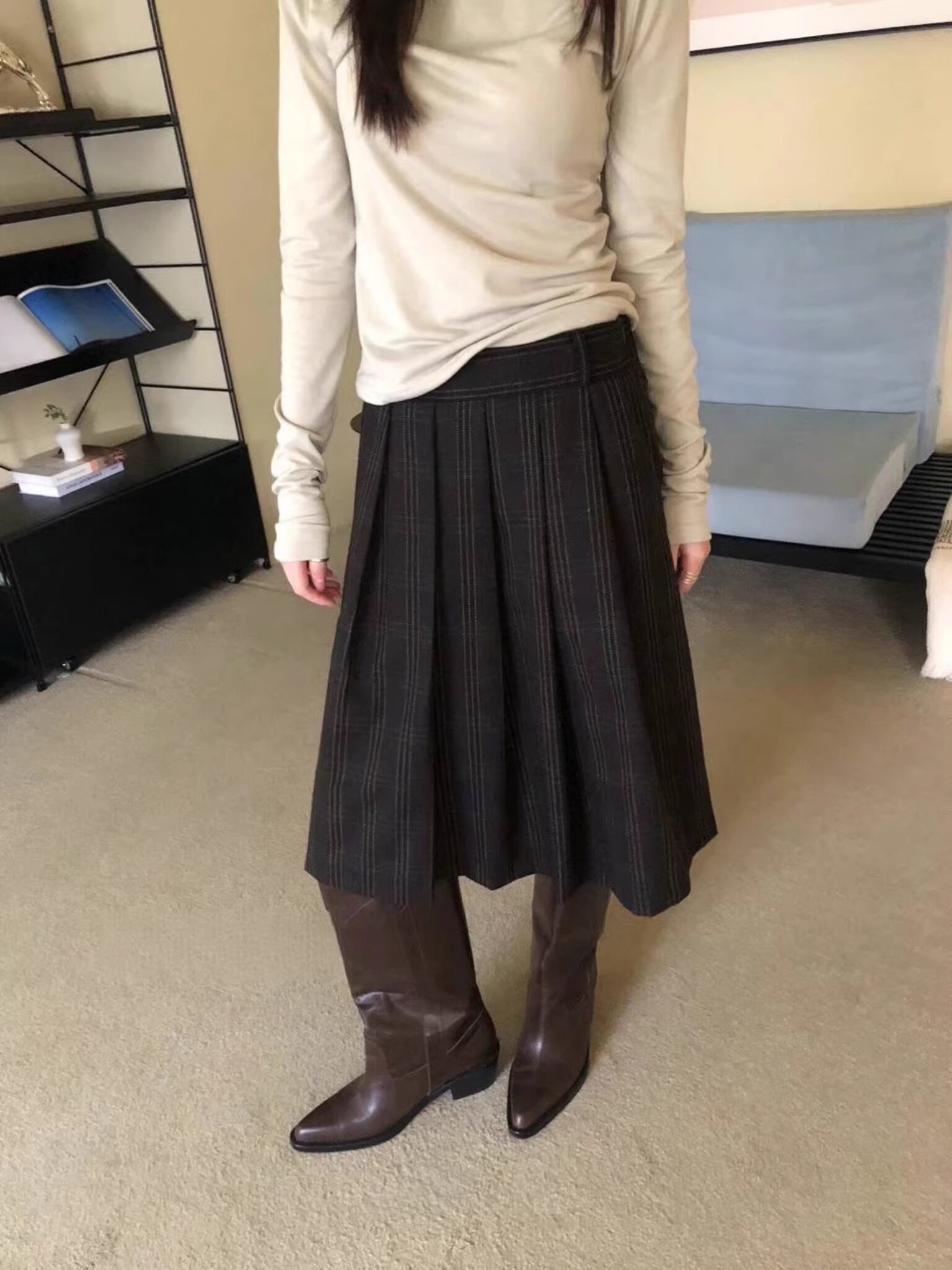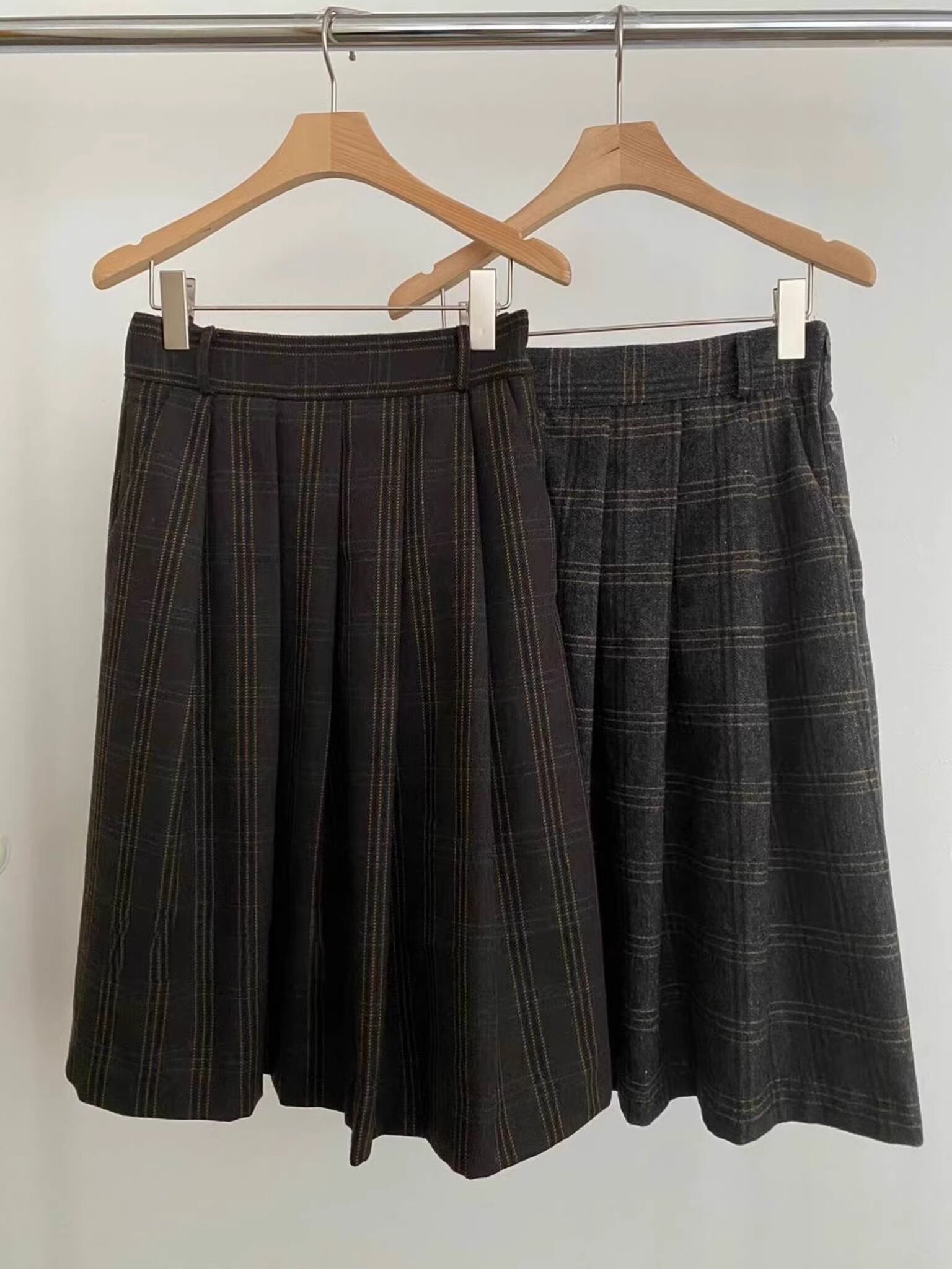 Exclusive type韩国个性复古格纹百搭显瘦百褶中长休闲滑面半身裙
