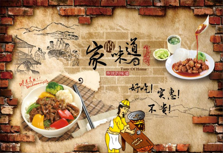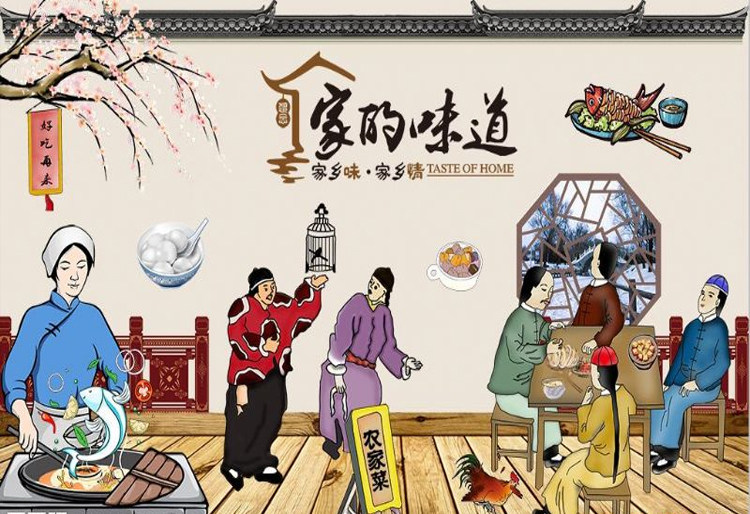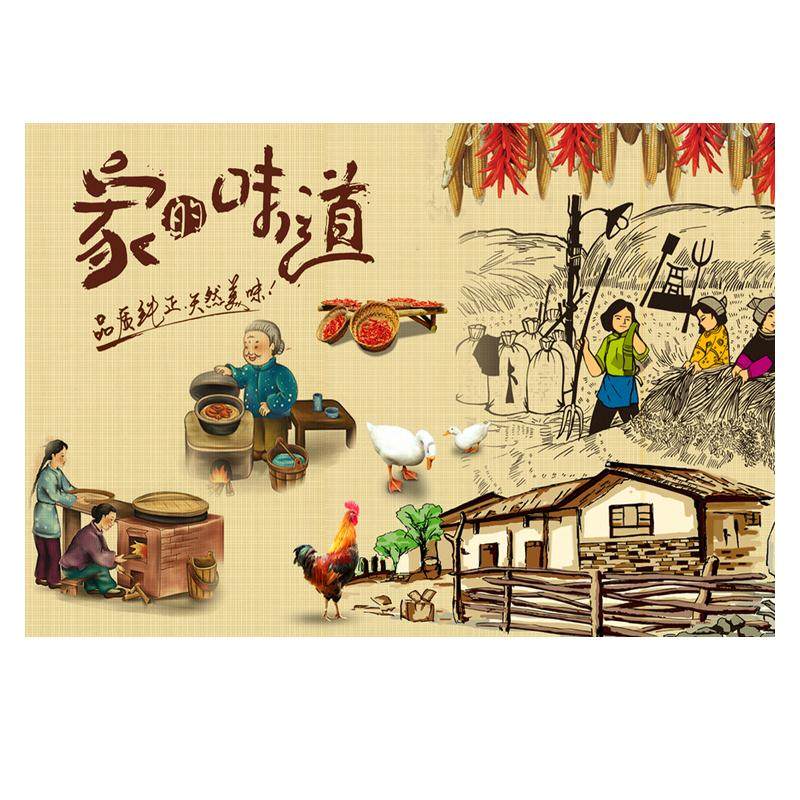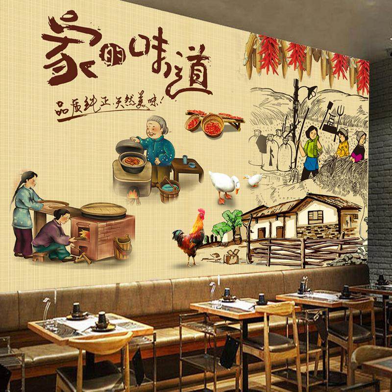 家的味道农家乐中式餐厅工装背景墙壁布壁纸饭店餐饮柴火烧鸡壁画