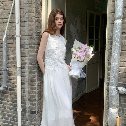 ZHUYIYI 白色蕾丝苎麻拼接无袖连衣裙女夏新款原创设计收腰显瘦