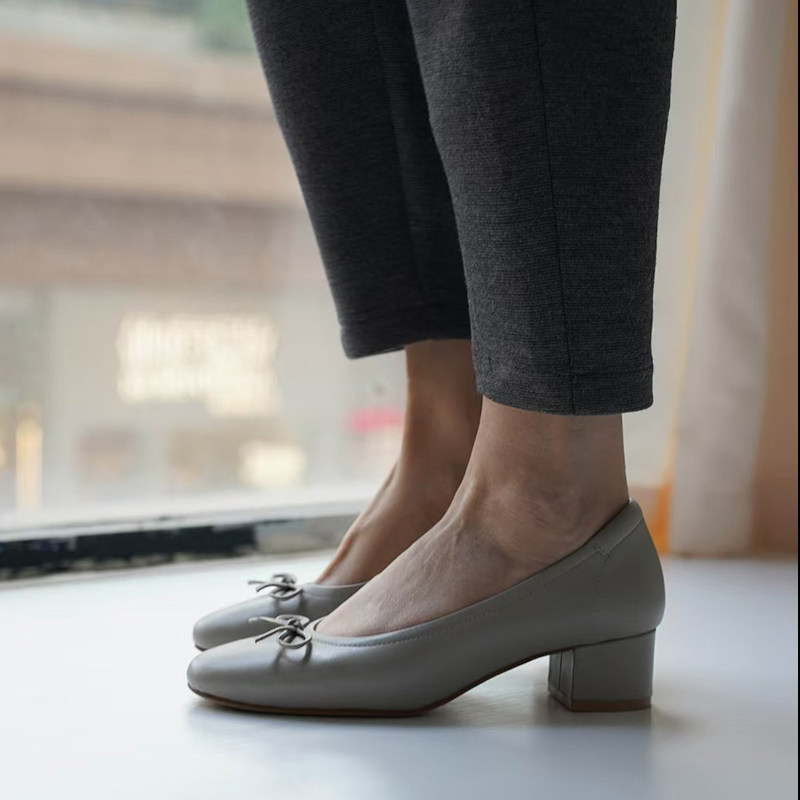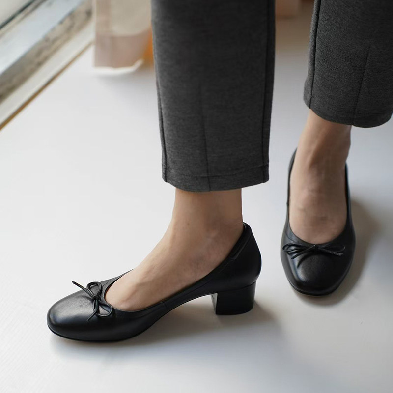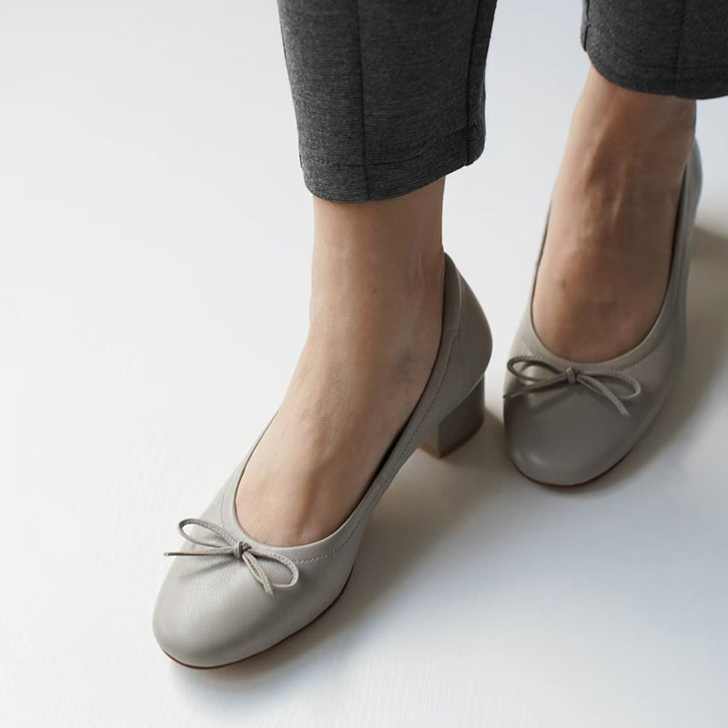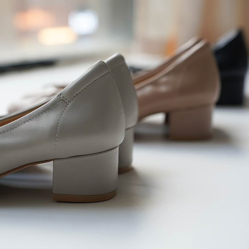 壹家shoes040042羊皮4cm圆头芭蕾风鞋子中跟通勤粗跟单鞋真皮女鞋