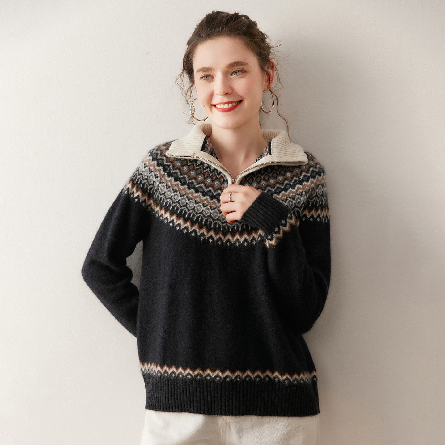 重工费尔岛山羊绒衫女半开领撞色提花半拉链毛衣无扎感针织打底衫
