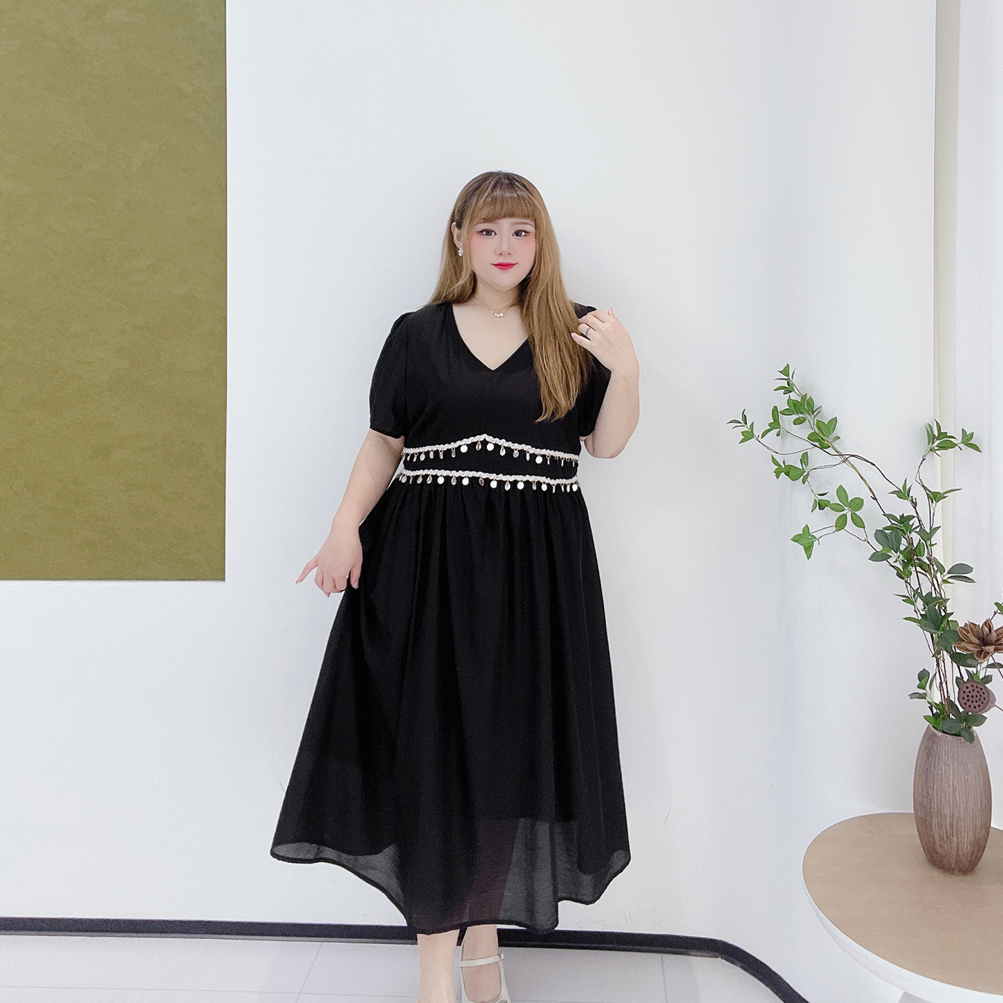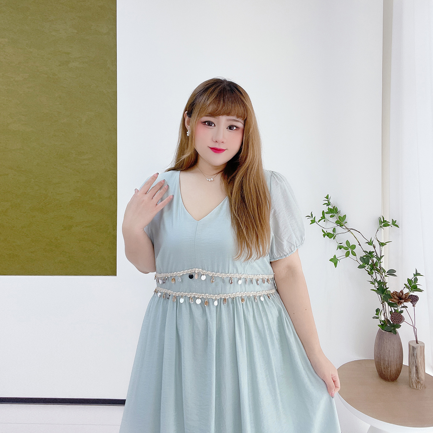 波西米亚风亮片长裙子胖莹莹大码女装夏收腰显瘦V领泡泡袖连衣裙