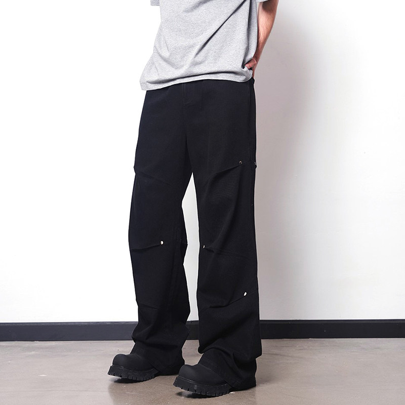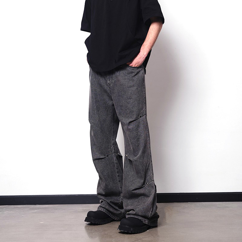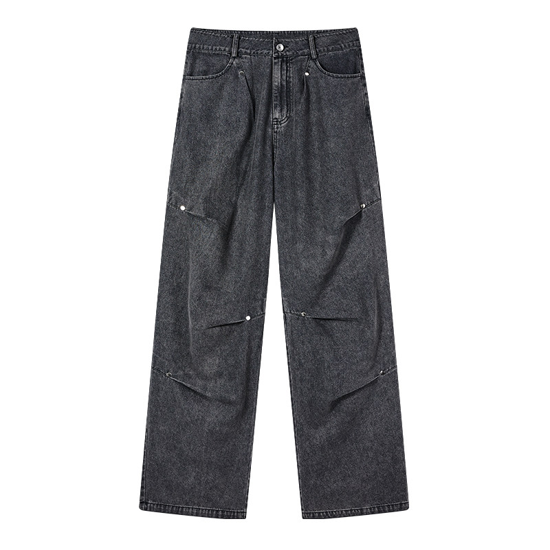 左奇函同款美式宽松直筒褶皱牛仔裤阔腿休闲裤男街头水洗工装裤子