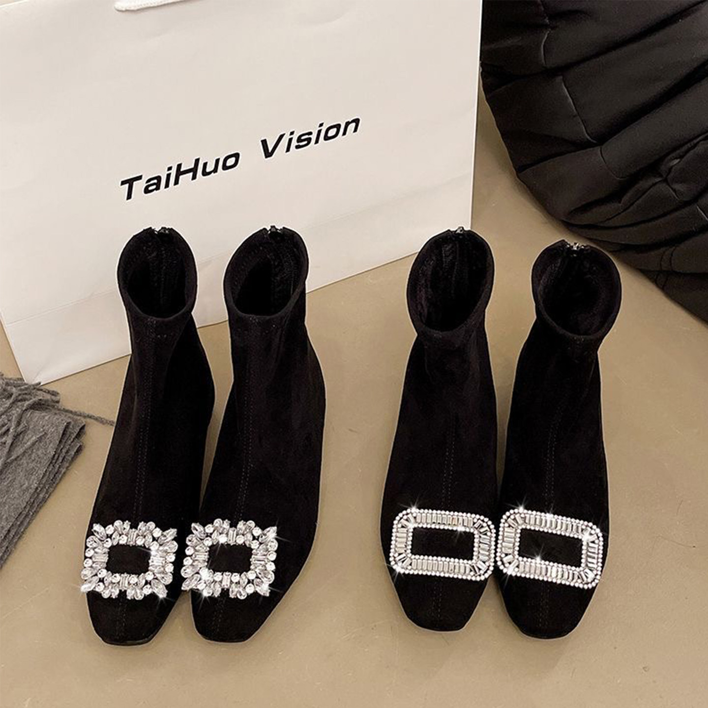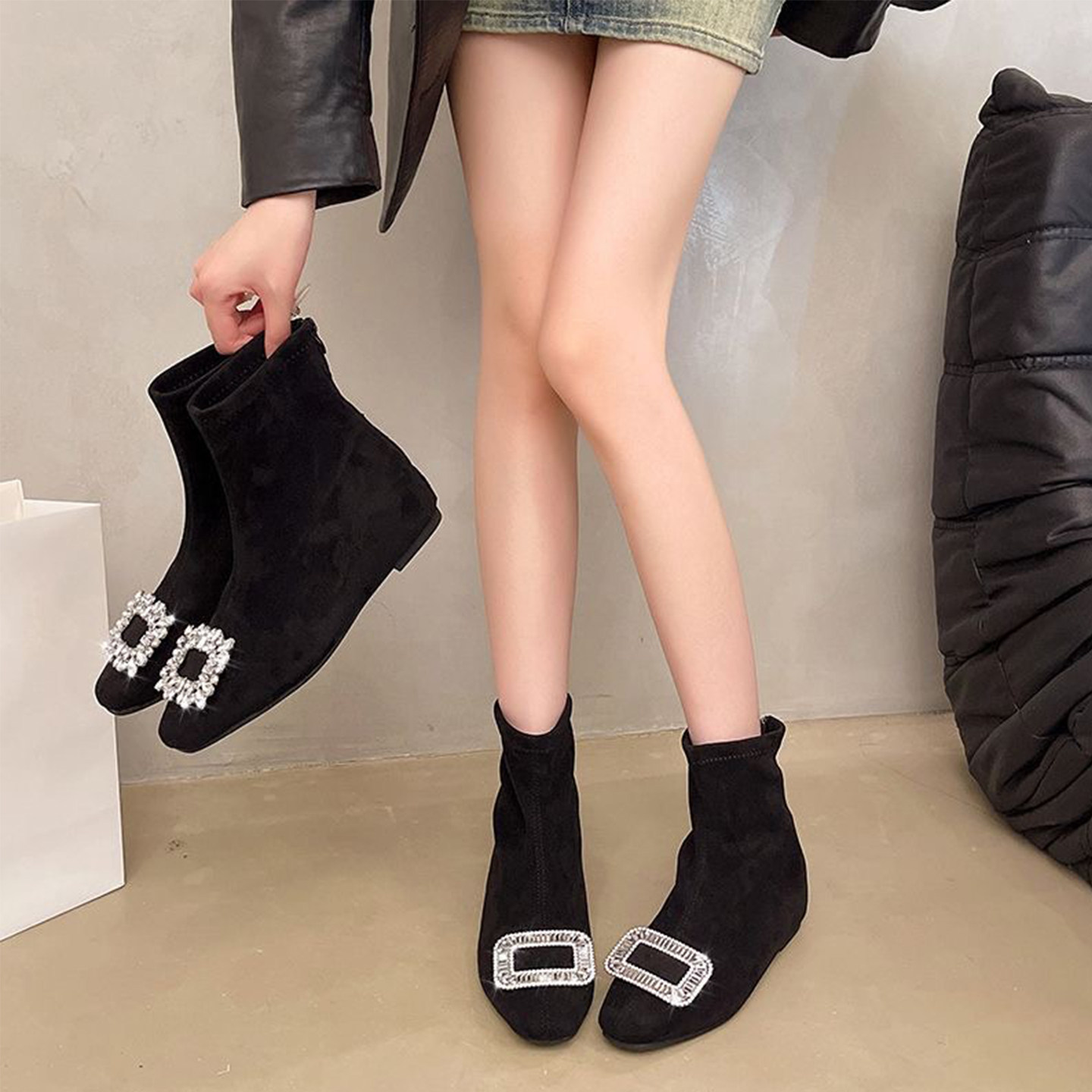 小码31 32 33水钻绒面方扣短靴女黑色百搭方头平底大码41马丁靴43