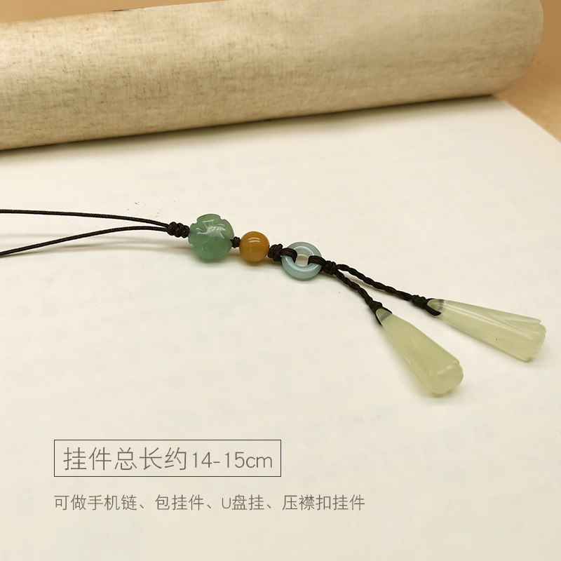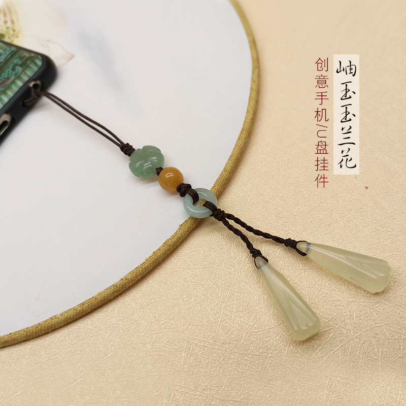 创意玉兰花玉石手机链挂件岫玉中国风钥匙扣u盘扇坠包包旗袍挂件
