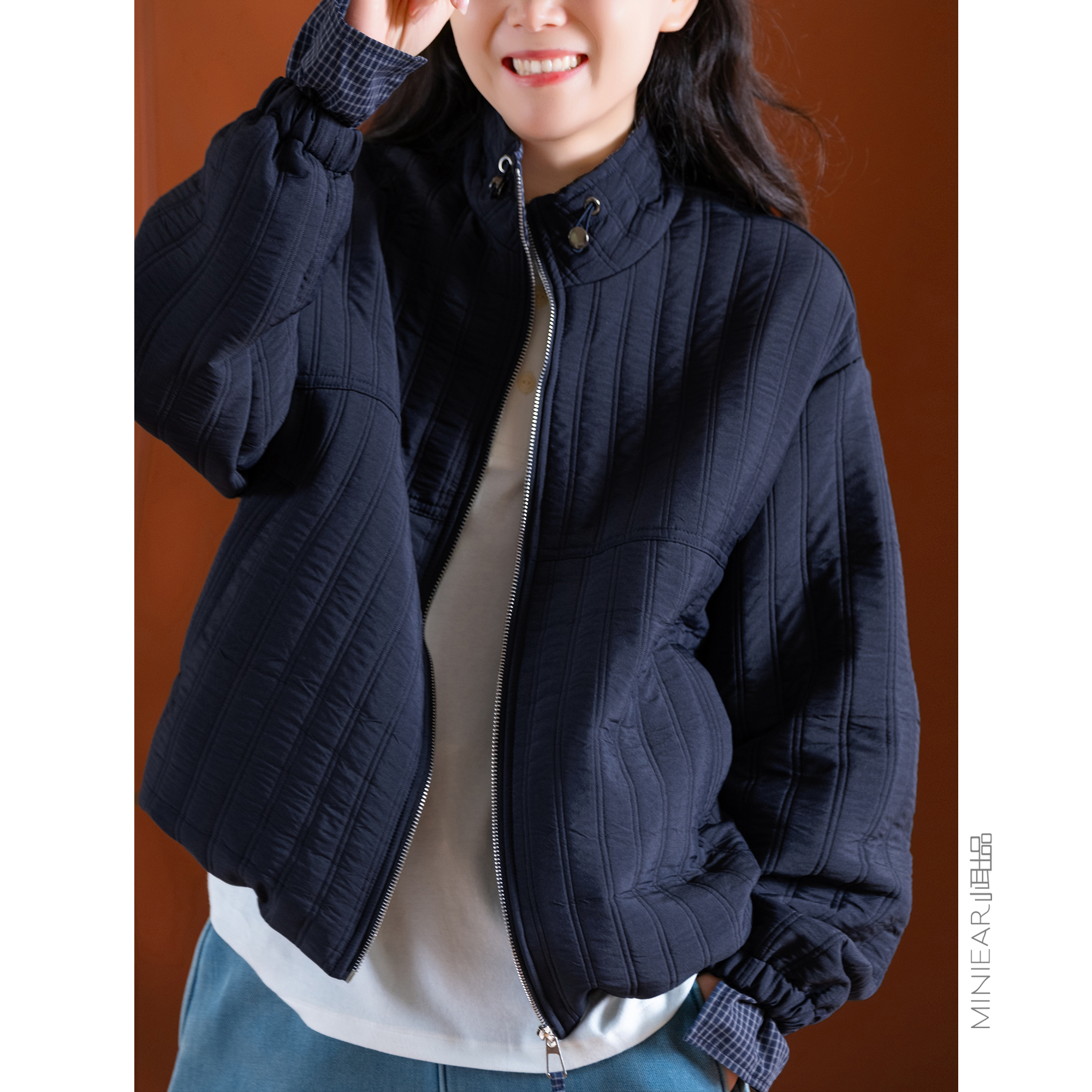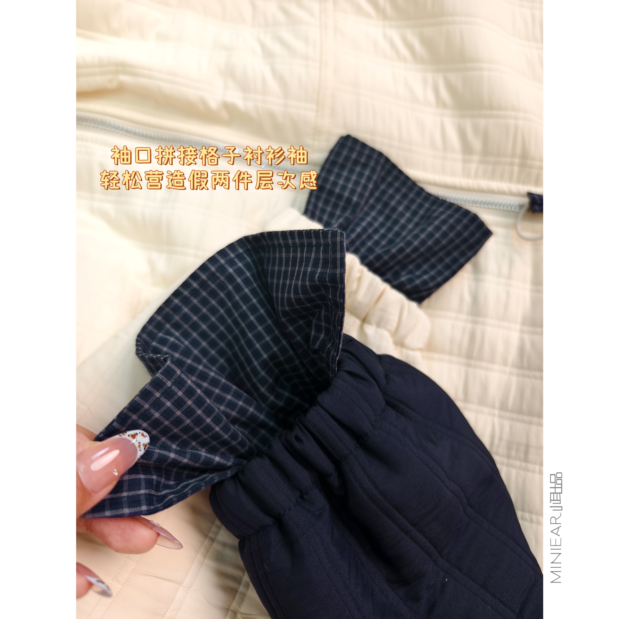 小耳出品 奶泡竖纹棉服/蓬松厚实/格纹拼接 休闲宽松竖绗线外套女