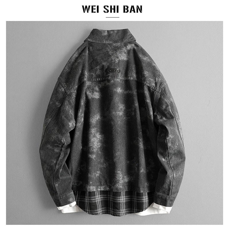 美式休闲复古扎染牛仔衬衫外套男春秋款假两件翻领夹克痞帅褂子男