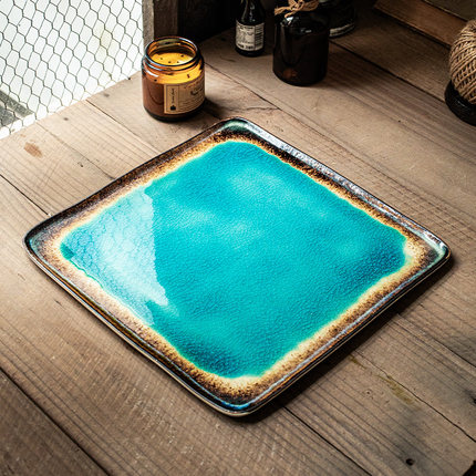 巷子尾〖海蓝冰裂镜面感〗10.5英寸陶瓷四方盘大号复古盘子#摆盘