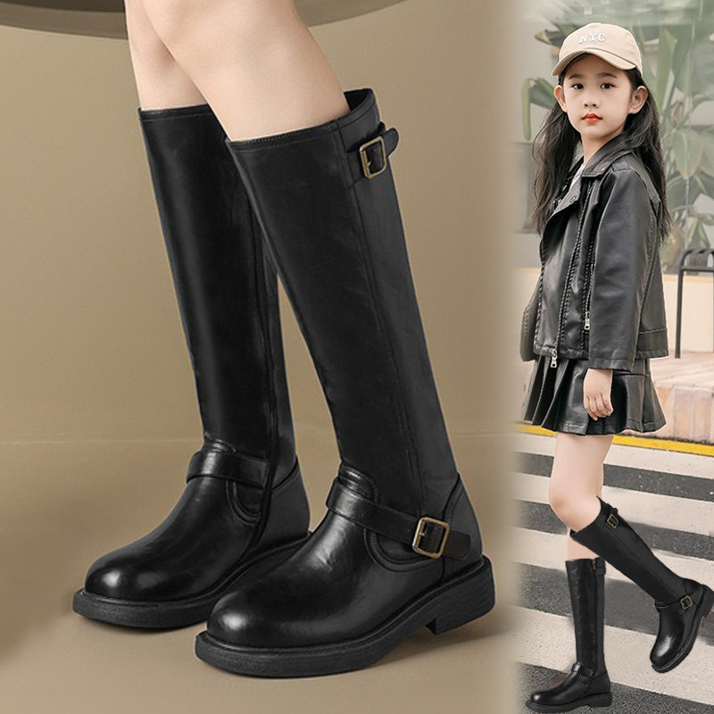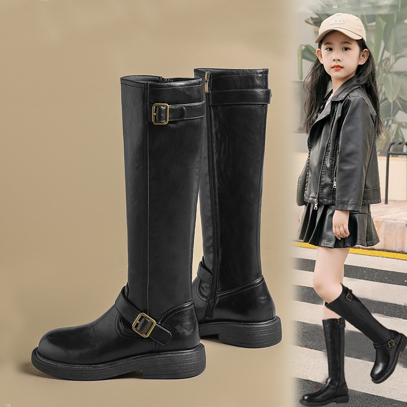 女童高筒靴2025秋冬加绒长筒靴二棉长靴黑色皮带扣女童骑士靴防滑