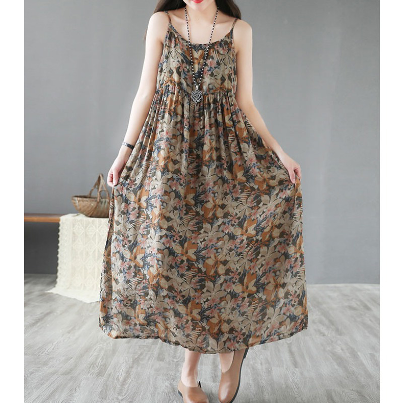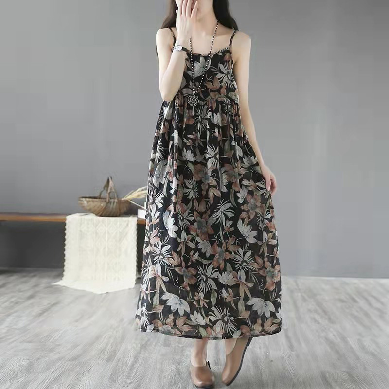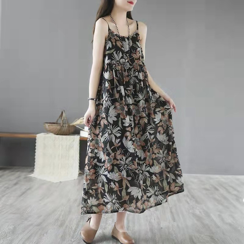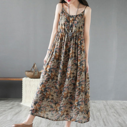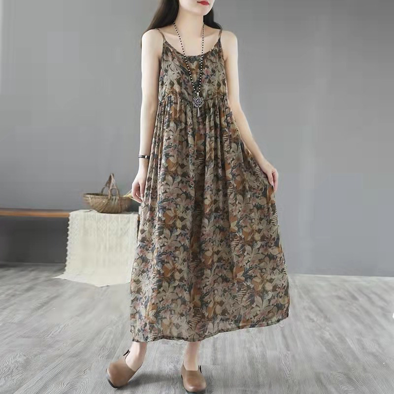 碎花吊带连衣裙女2024春夏新款复古文艺宽松休闲亚麻A字背心长裙