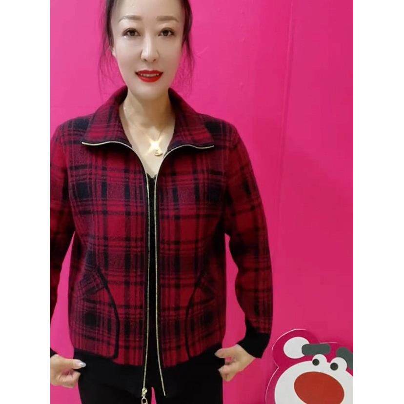 中老年女装妈妈装格子拉链外套秋冬新款宽松毛呢阔太太开衫上衣厚