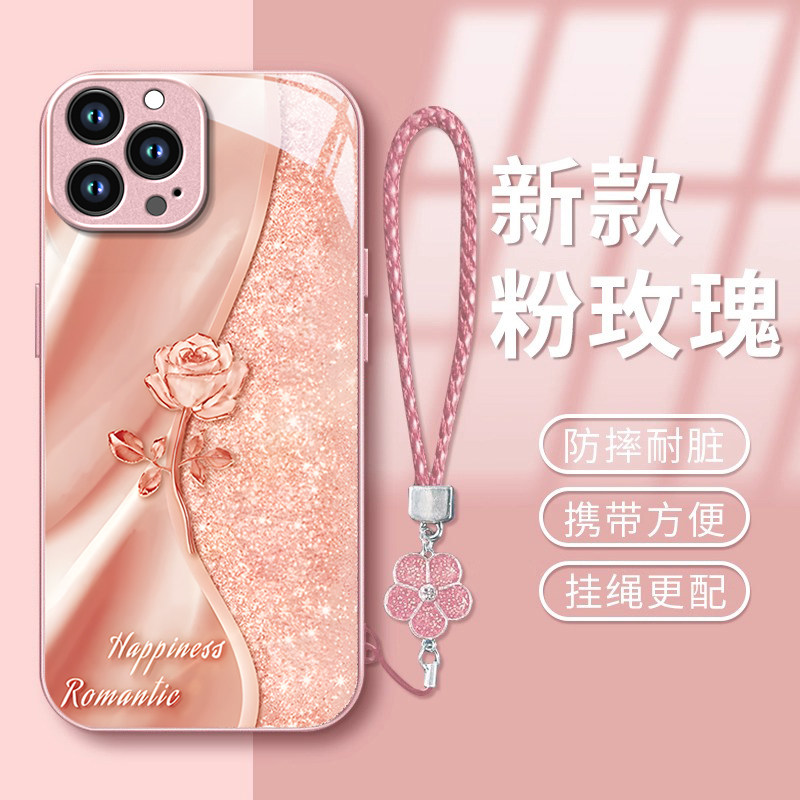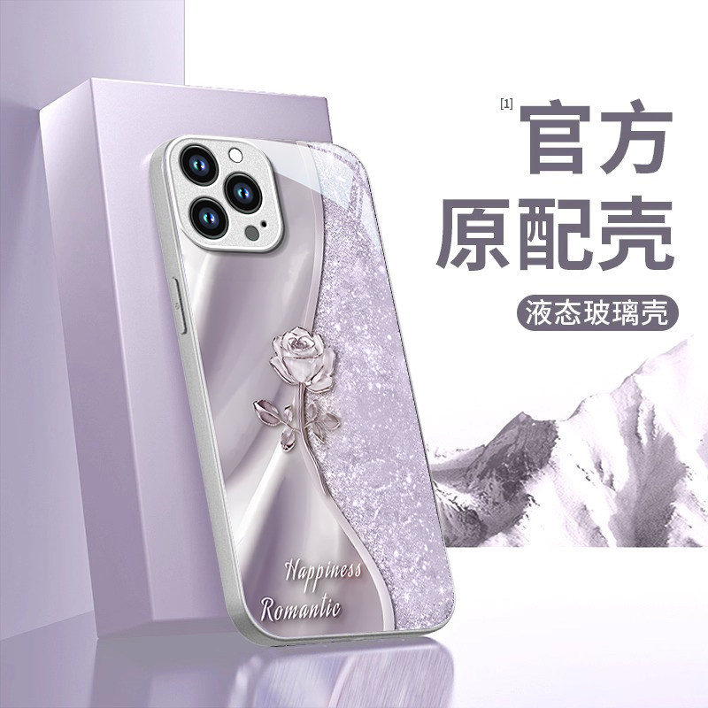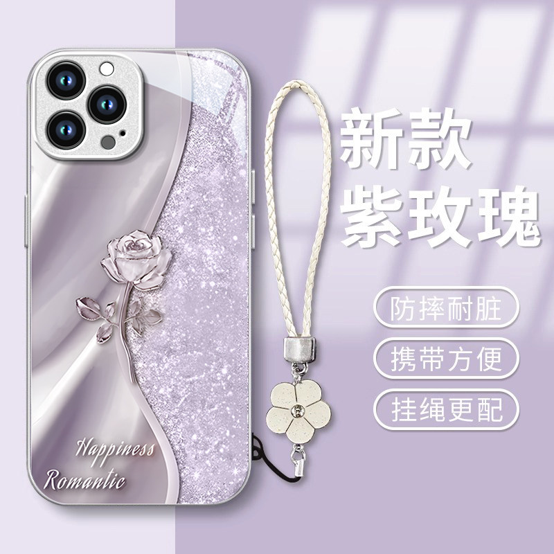 适用苹果16Promax手机壳新款iPhone15奢华14Plus紫色玫瑰13玻璃12mini保护套11全包xs防摔7壳8带6s带挂绳se3