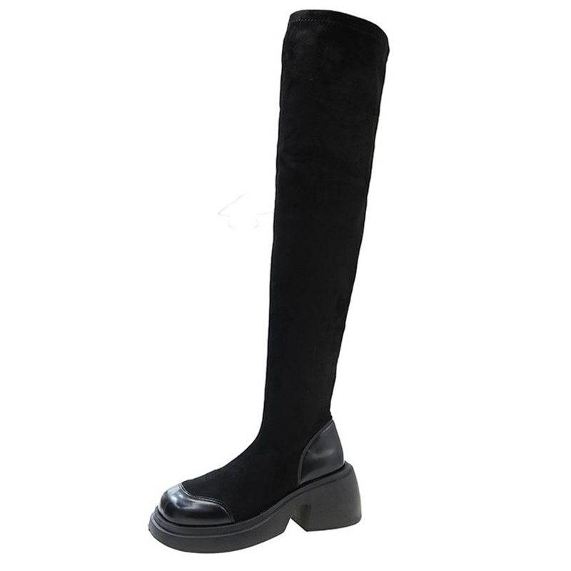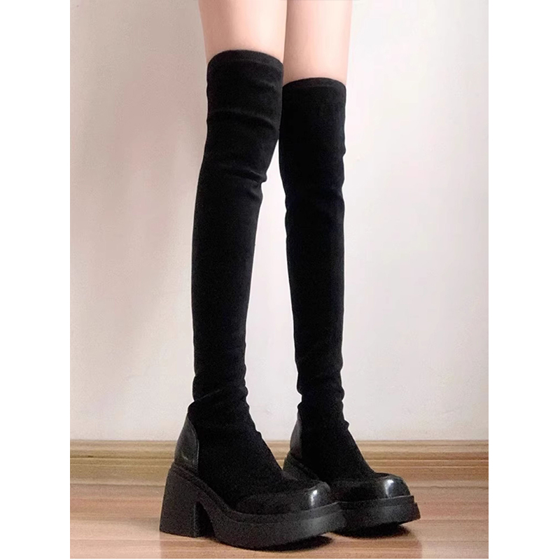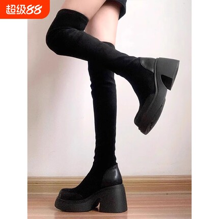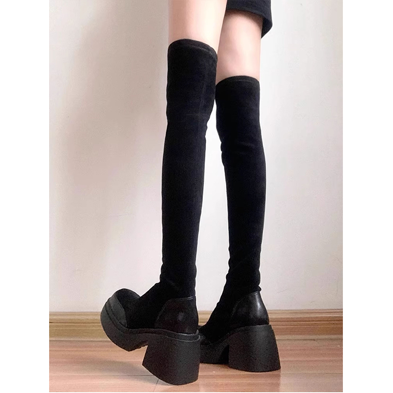 黑色绒面弹力靴女2025年冬季新款厚底粗跟过膝靴瘦瘦靴袜靴长靴子