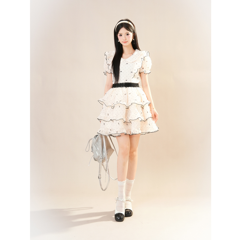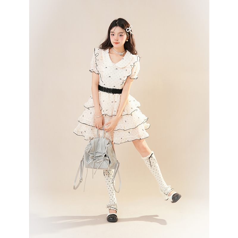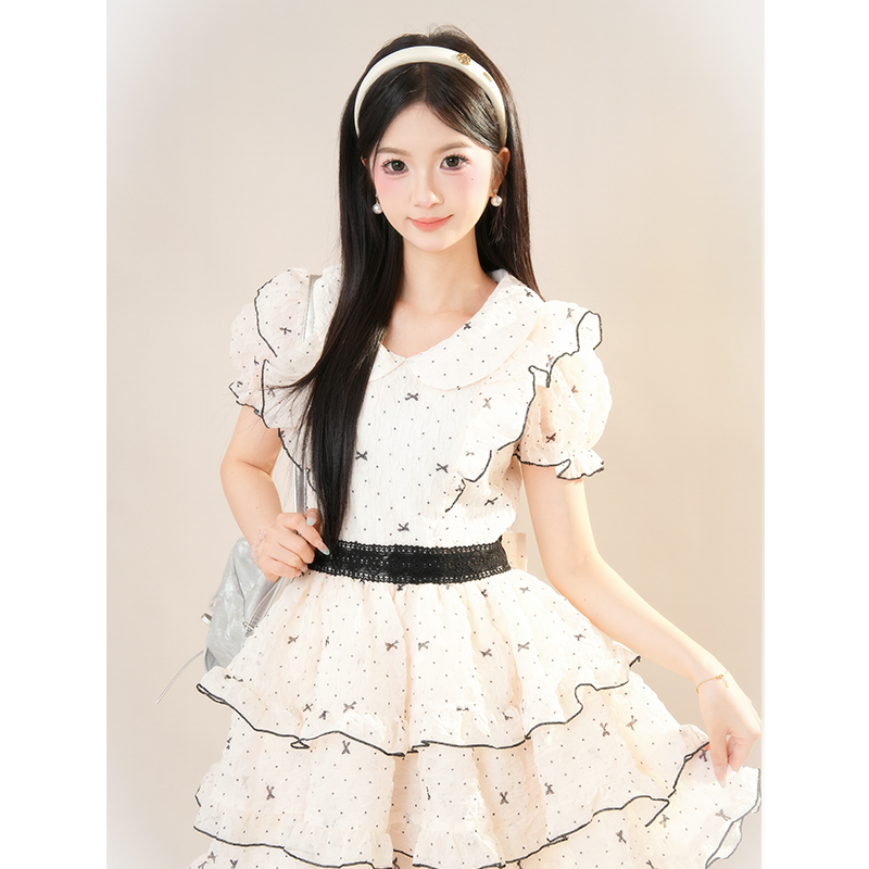 可爱甜美少女感蝴蝶结蛋糕短裙女2025夏季新款波点收腰蓬蓬连衣裙
