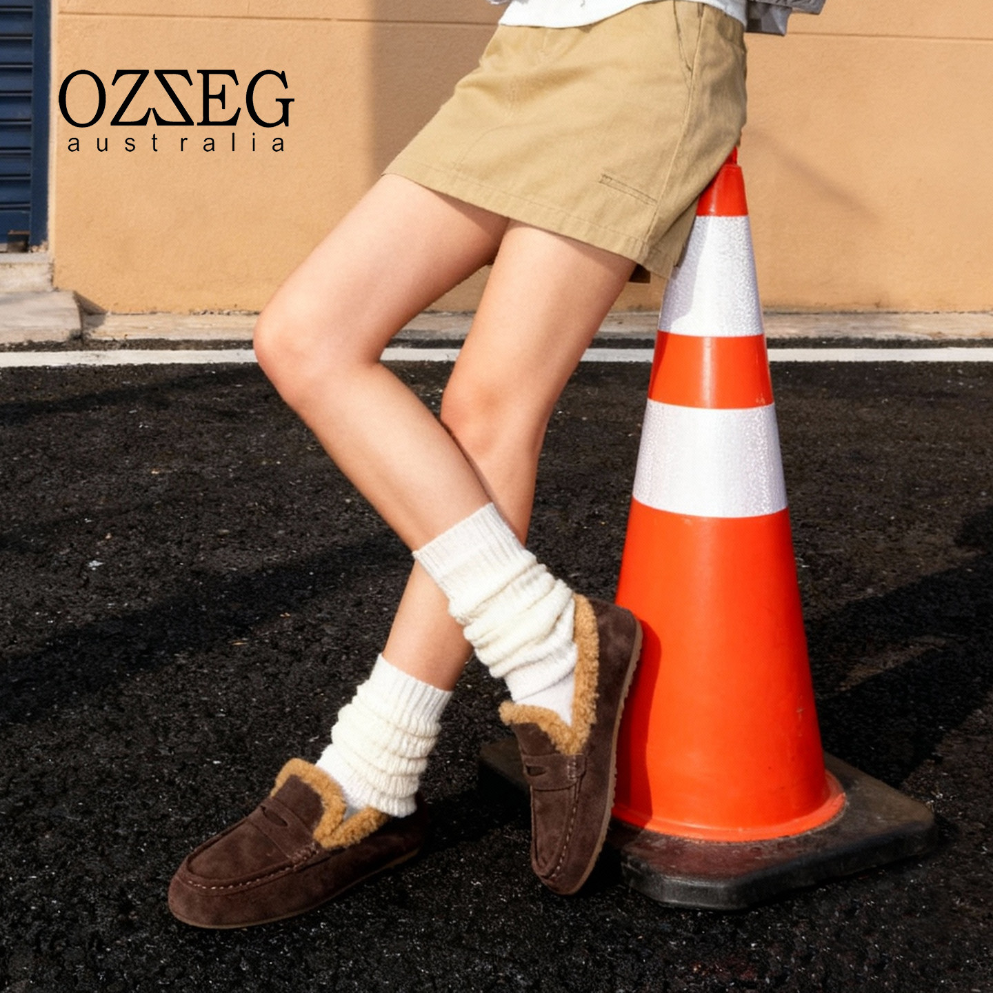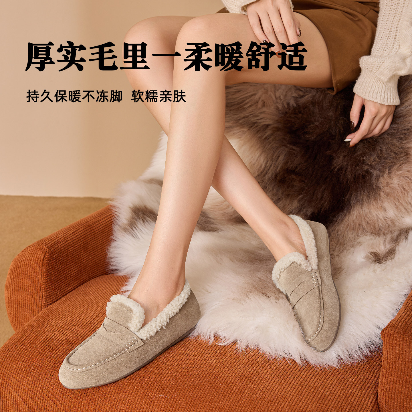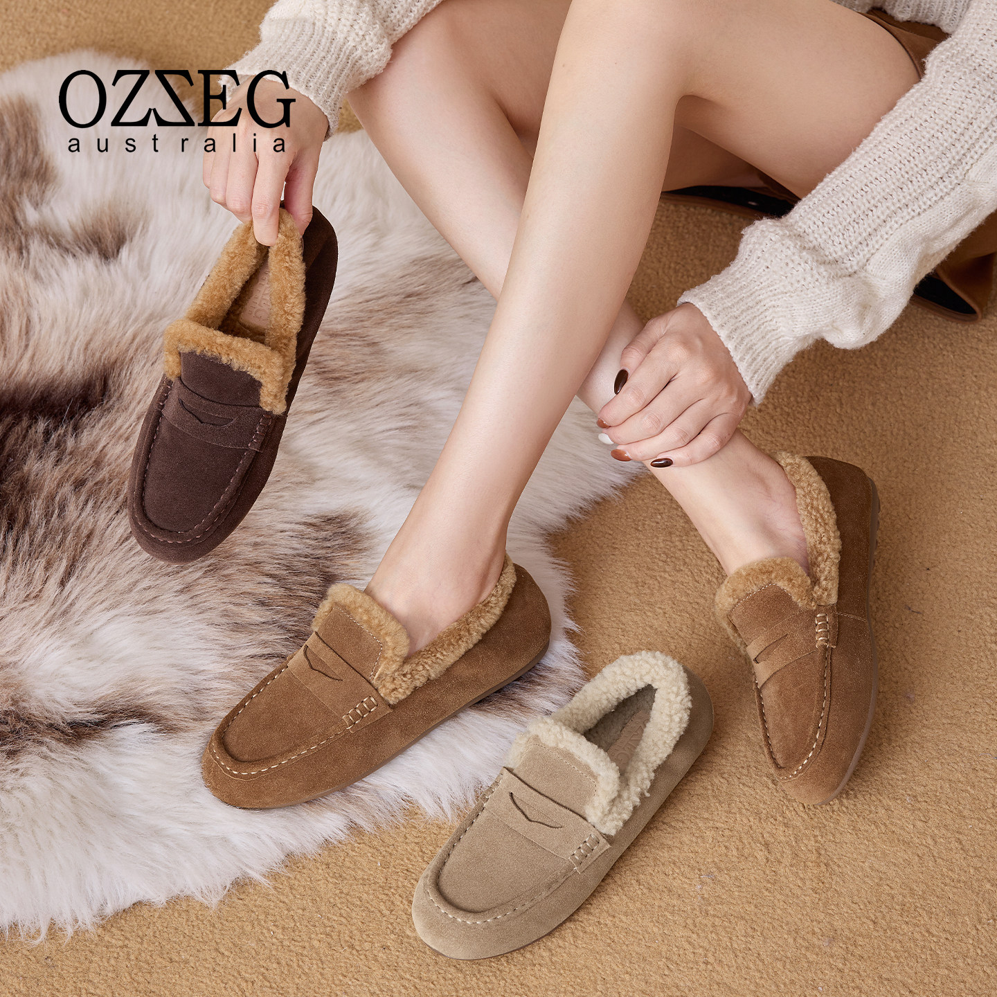 OZZEG2025秋冬新款皮毛一体保暖豆豆鞋女加绒加厚一脚蹬乐福单鞋
