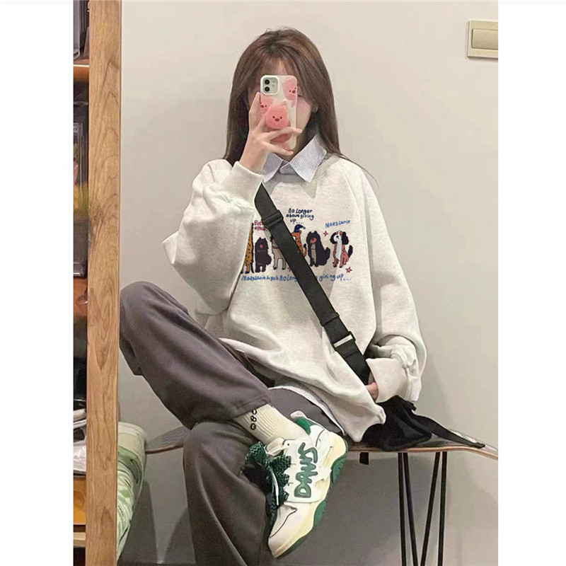 纯棉美式复古卡通圆领卫衣女2025新款设计感宽松套头无帽长袖上衣
