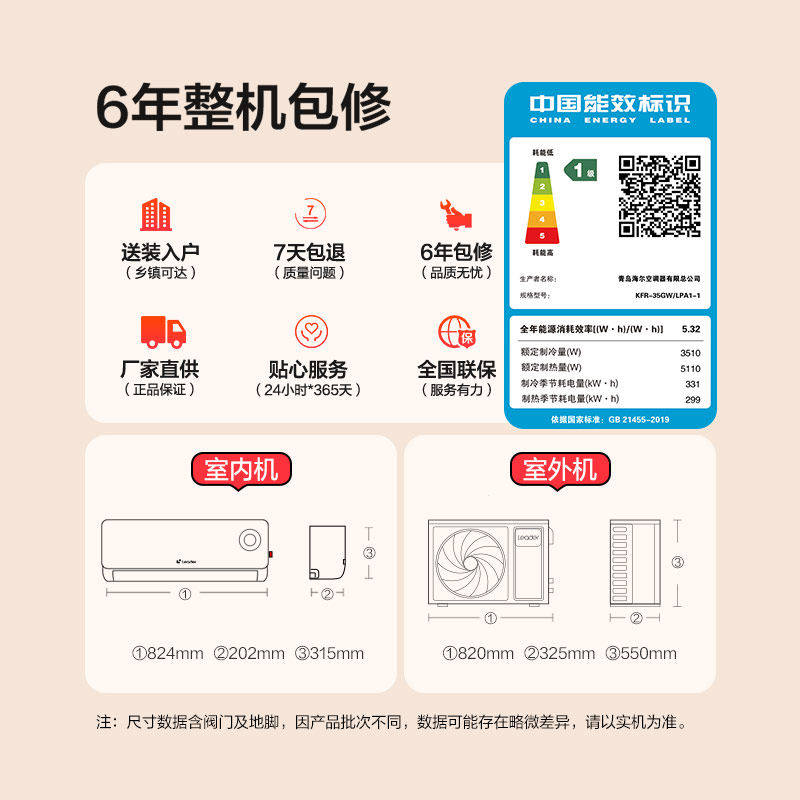 纯铜管】海尔新一级统帅大1匹1.5匹变频冷暖挂机壁挂空调净省电E1