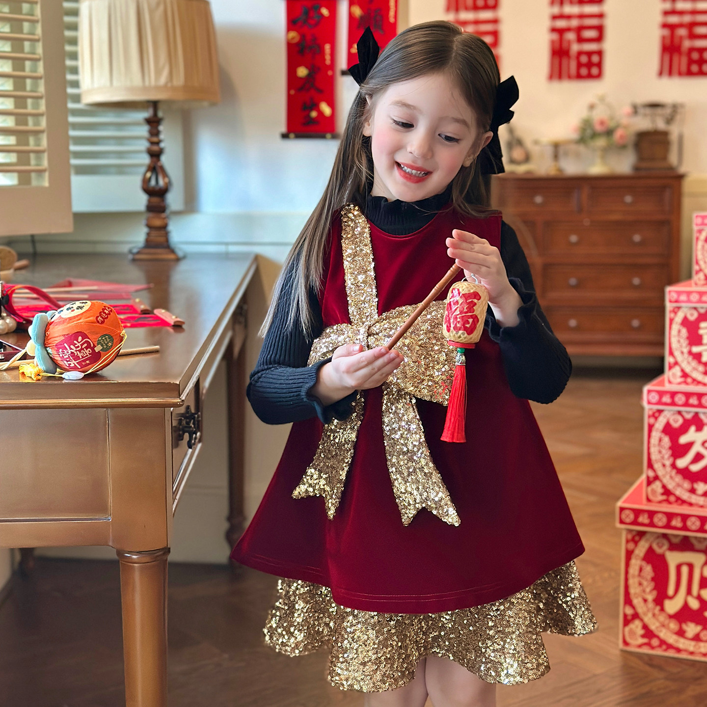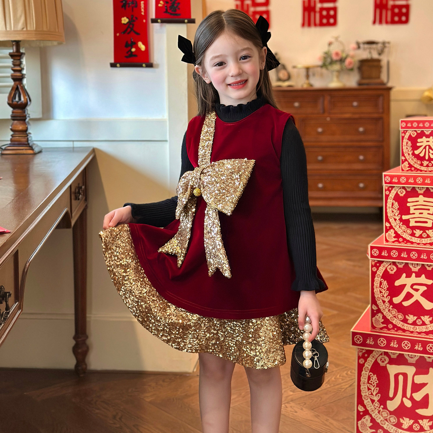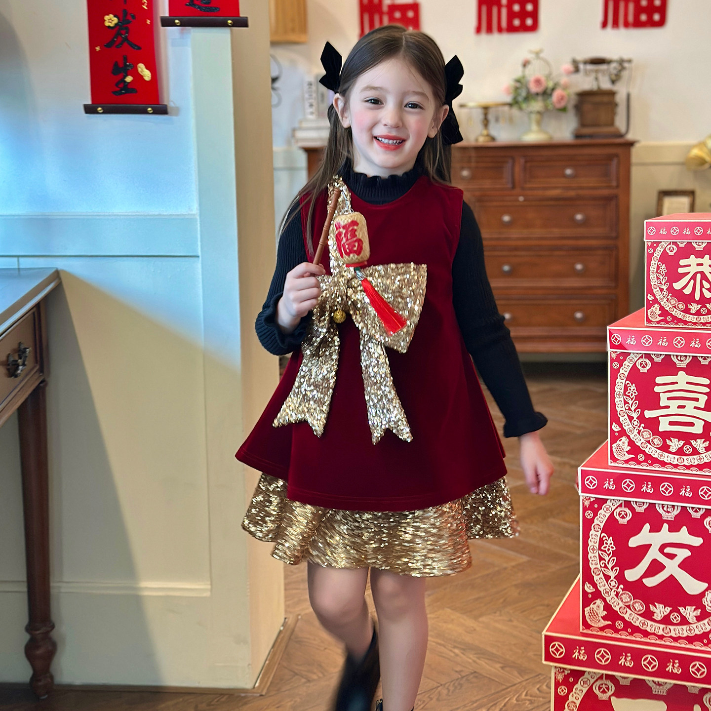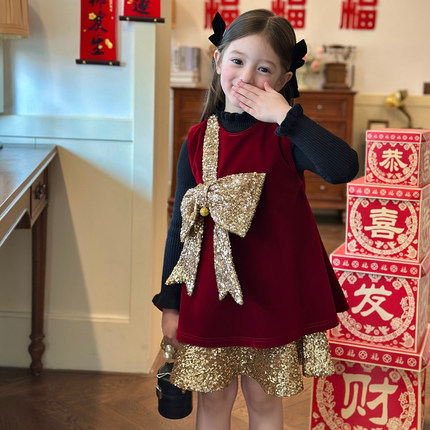 栀了成长记童装女童红色蝴蝶结背心裙2026春秋儿童新年加绒连衣裙