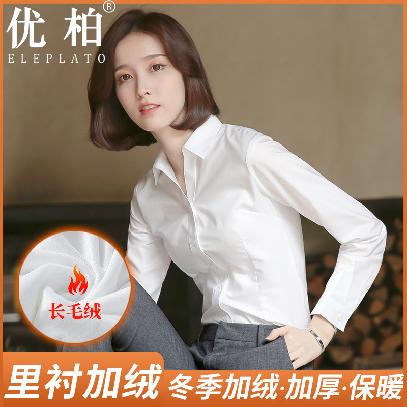 优柏加绒衬衫女白色长袖冬季加厚职业工作服长毛绒保暖工装白衬衣