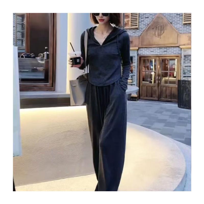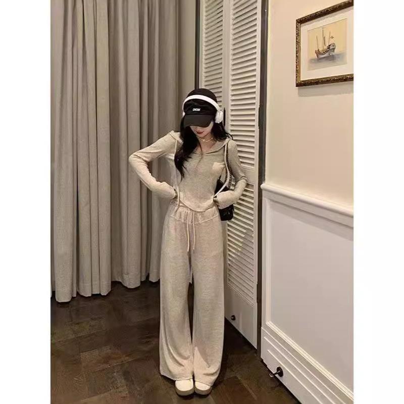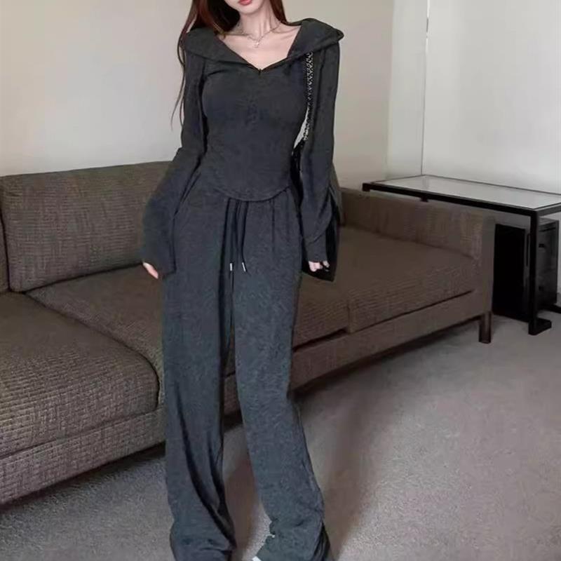 休闲流行休闲套装秋冬季新款纯色拉链短款连帽开衫卫衣两件套女装