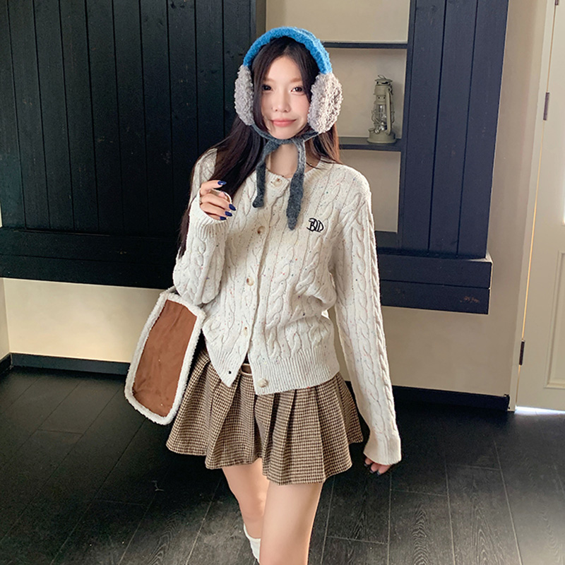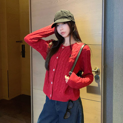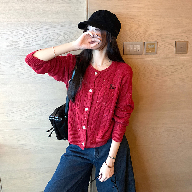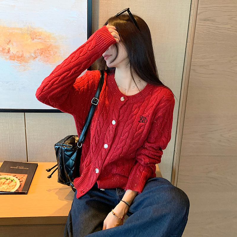 秋冬红色毛衣开衫外套女小个子麻花针织衫闪闪混色高级感正肩加厚