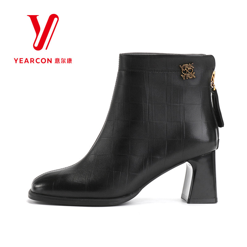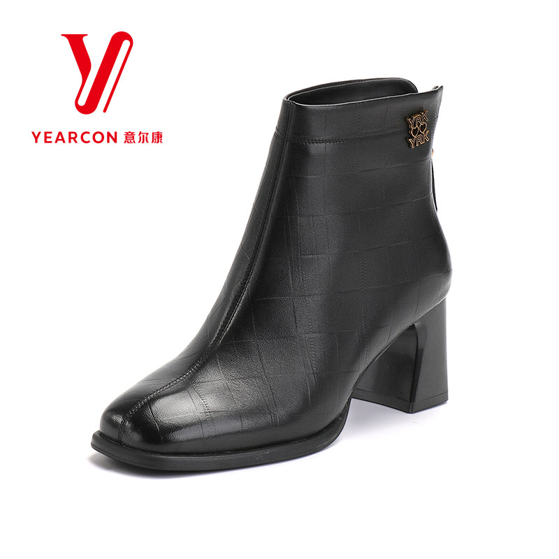 意尔康女鞋冬季新款羊皮女靴粗跟高跟气质时尚百搭加绒加厚短靴子